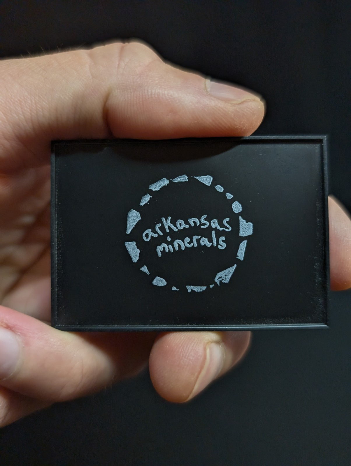 It is mounted in our new boxes we designed and made utilizing a naturally UV reactive Pine knot wood that comes from our land in Arkansas. The back is a photographic print of one of our photos of the Ouachita mountain range in Saline County, Arkansas. These are unique and exclusive to our shop.