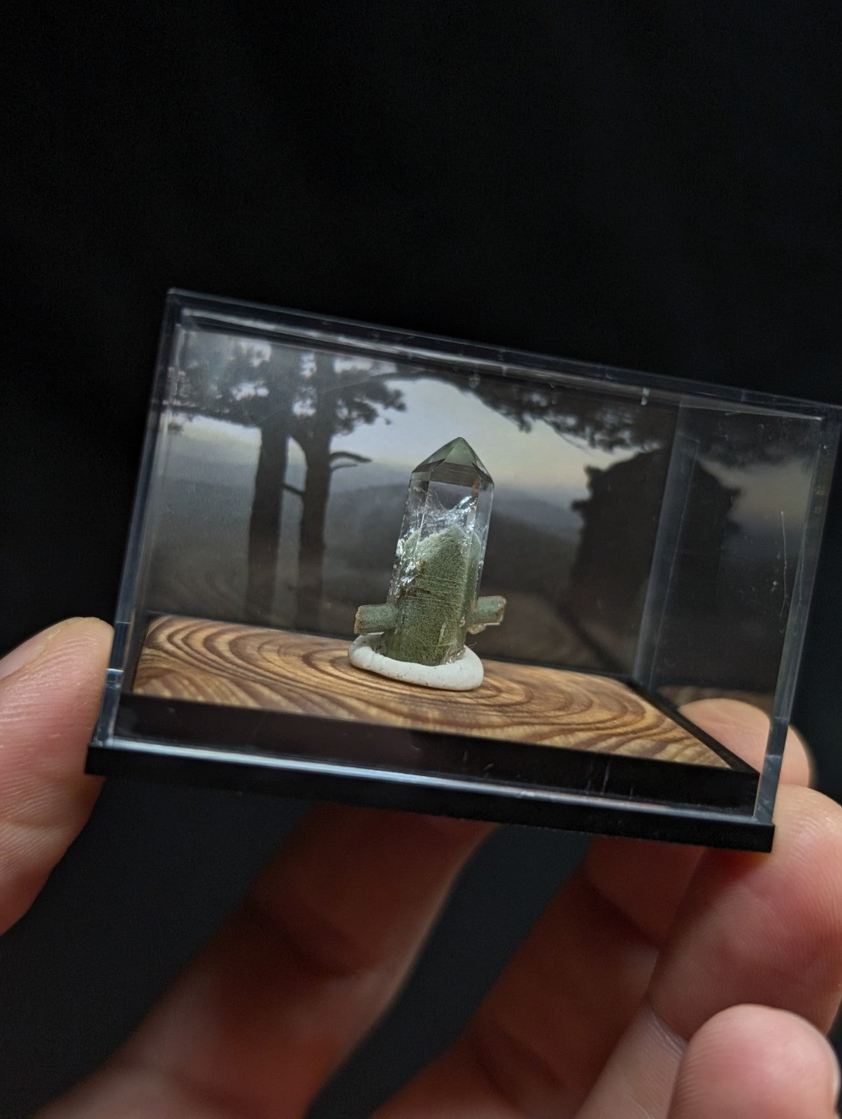 A+ Chlorite Phantom Quartz, w/ wood mount + photo case -Willis Mine, Arkansas