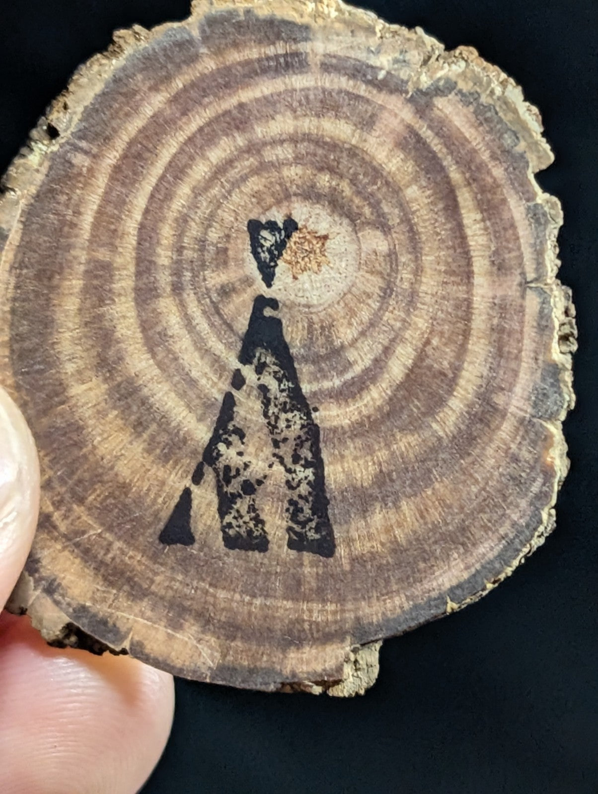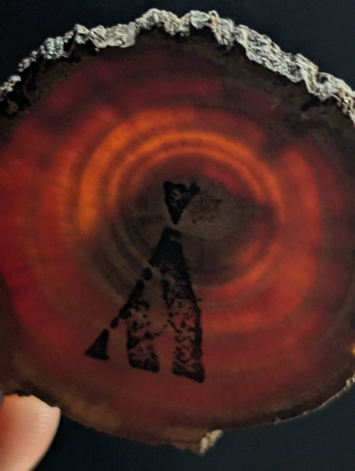 Old stock Faden Quartz Crystal point w/ beautiful form and excellent clarity. Excellent aesthetics as well. The point comes mounted with ticky tacky on a naturally uv-reactive pine knot wood base that also illuminates nicely when light shines through it. The wood itself is naturally infused with the resin of the tree it came from, so it smells wonderful too, like the Arkansas forests from where it was unearthed.
