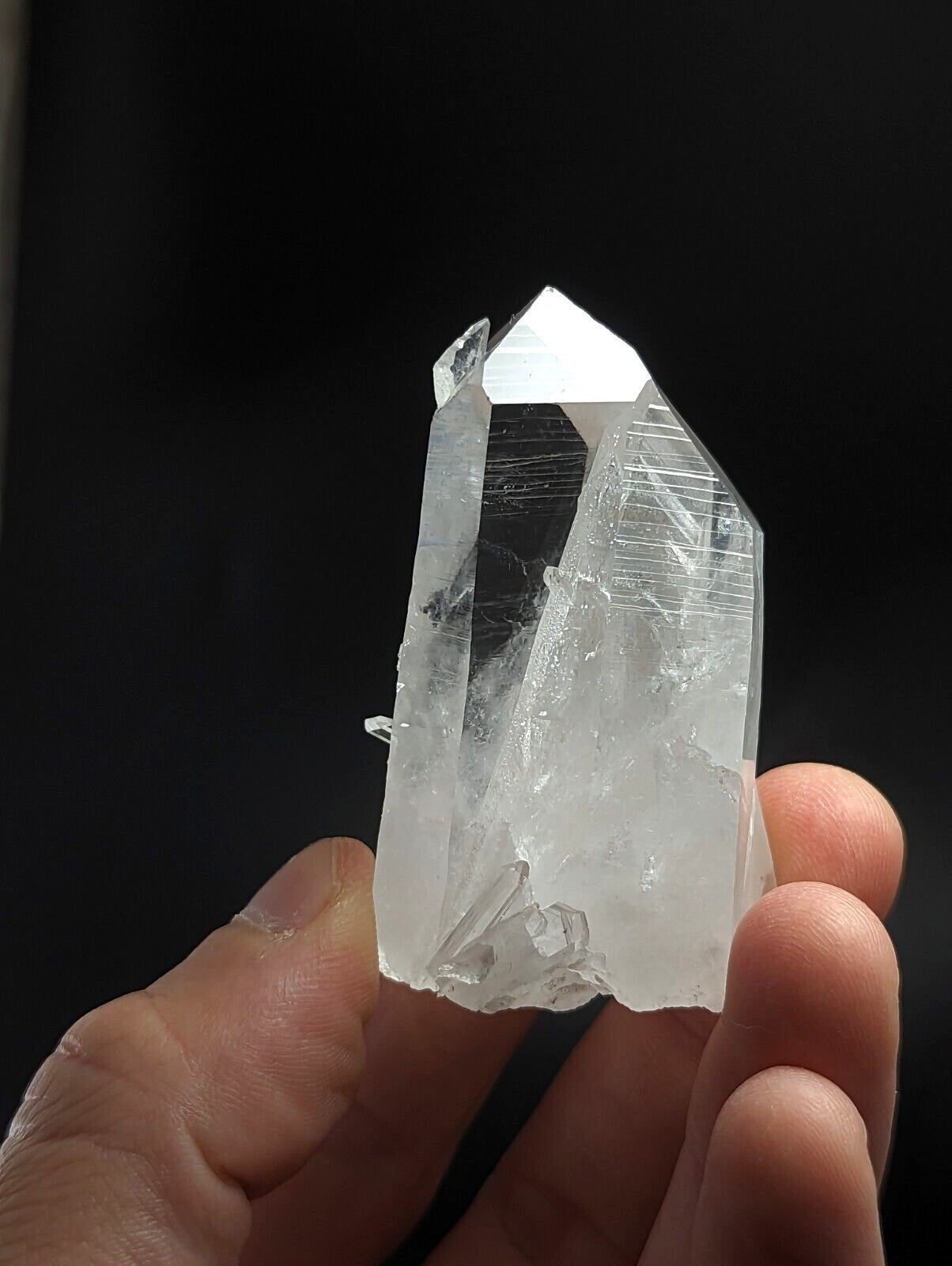 Amazing old stock Quartz Crystal w/ excellent clarity and beautiful form. Features a nice little Muzo habit crystal point hitchhiking on the side of one of the main facets (which is super unique!). Beautiful etchings can be seen in several areas of the piece as well....including some "concentrically" occurring triangulations (record keeper esque).