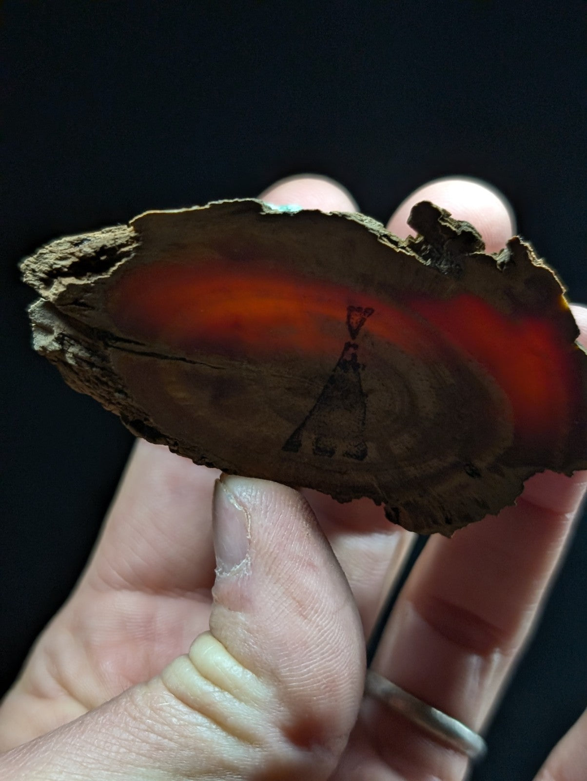 The specimen comes mounted with ticky tacky on a naturally uv-reactive pine knot wood base that also illuminates nicely when light shines through it. The wood itself is naturally infused with the resin of the tree it came from, so it smells wonderful too, like the Arkansas forests from where it was unearthed.