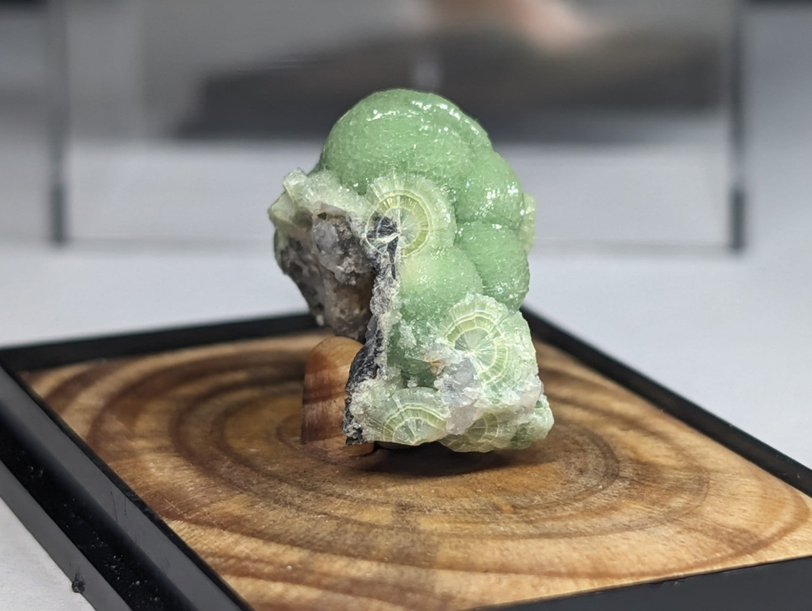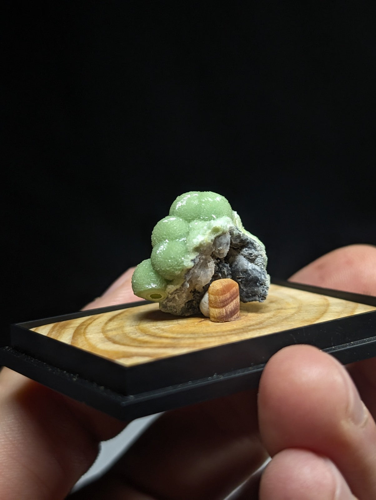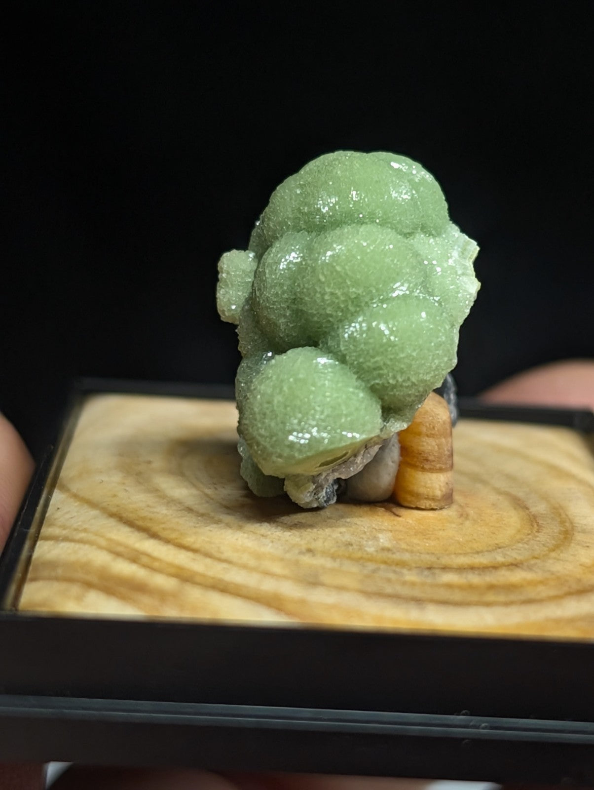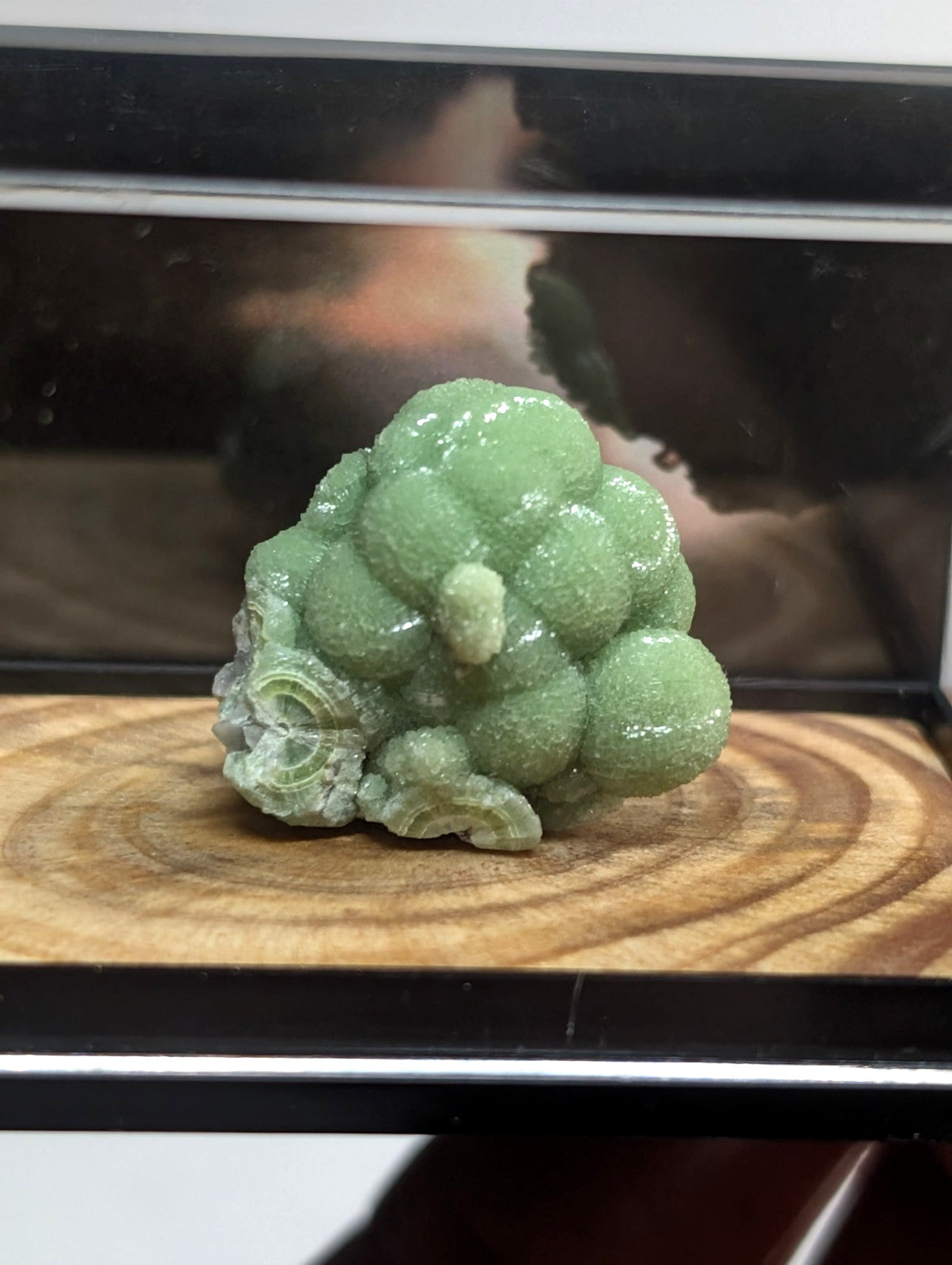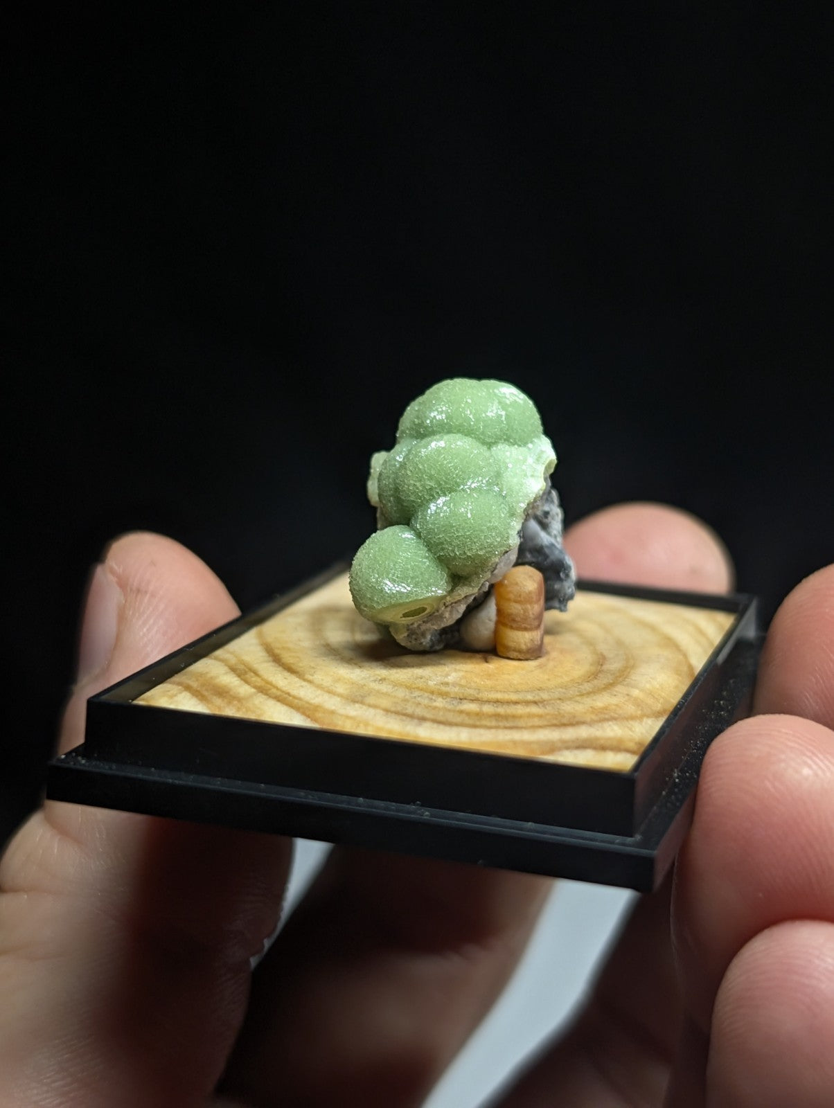 It is mounted in our new boxes we designed and made utilizing a naturally UV reactive Pine knot wood that comes from our land in Arkansas. The back is a photographic print of one of our photos showing an example of the inside of a "vug" of Wavellite from Arkansas (like a crystal cave of sorts). These are unique and exclusive to our shop.
