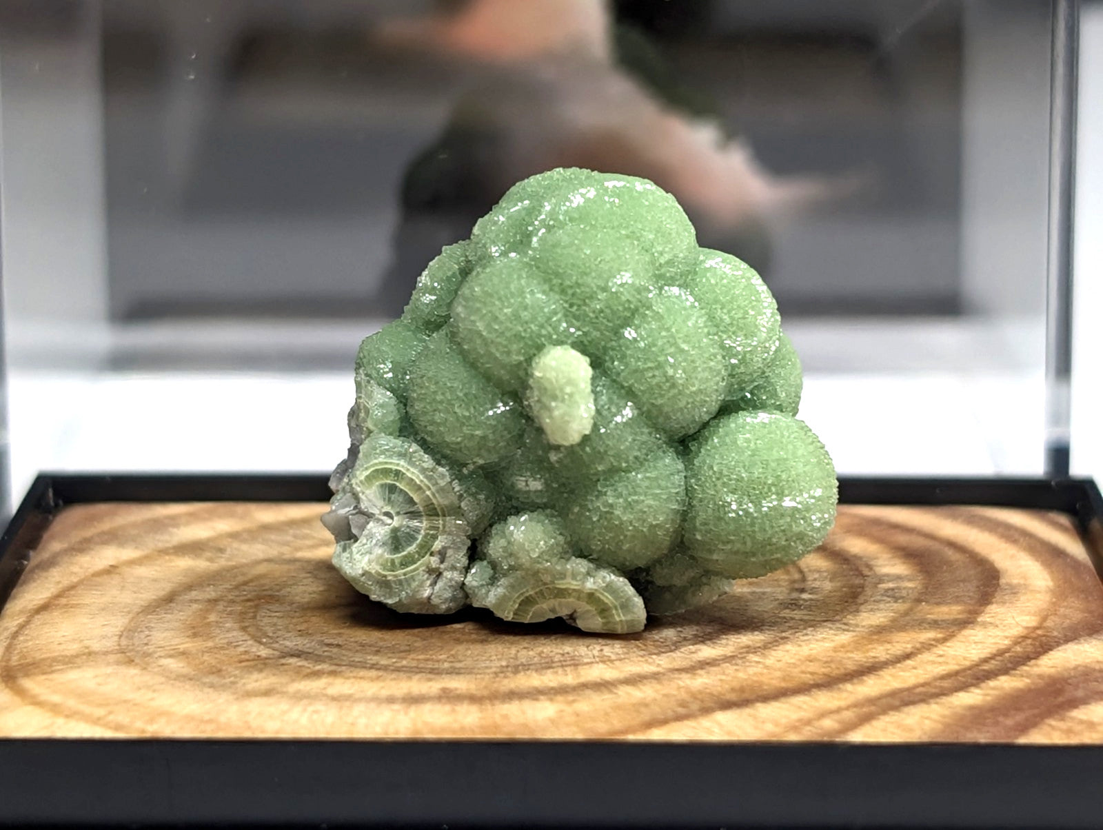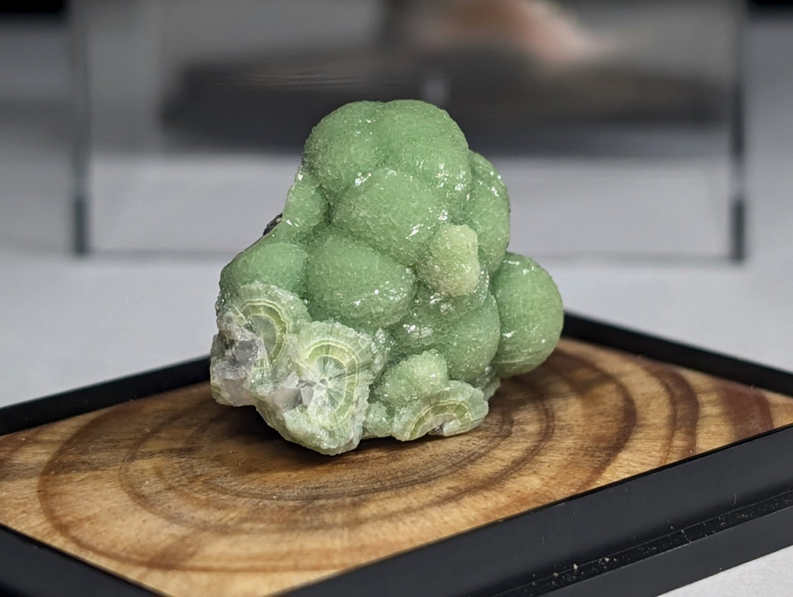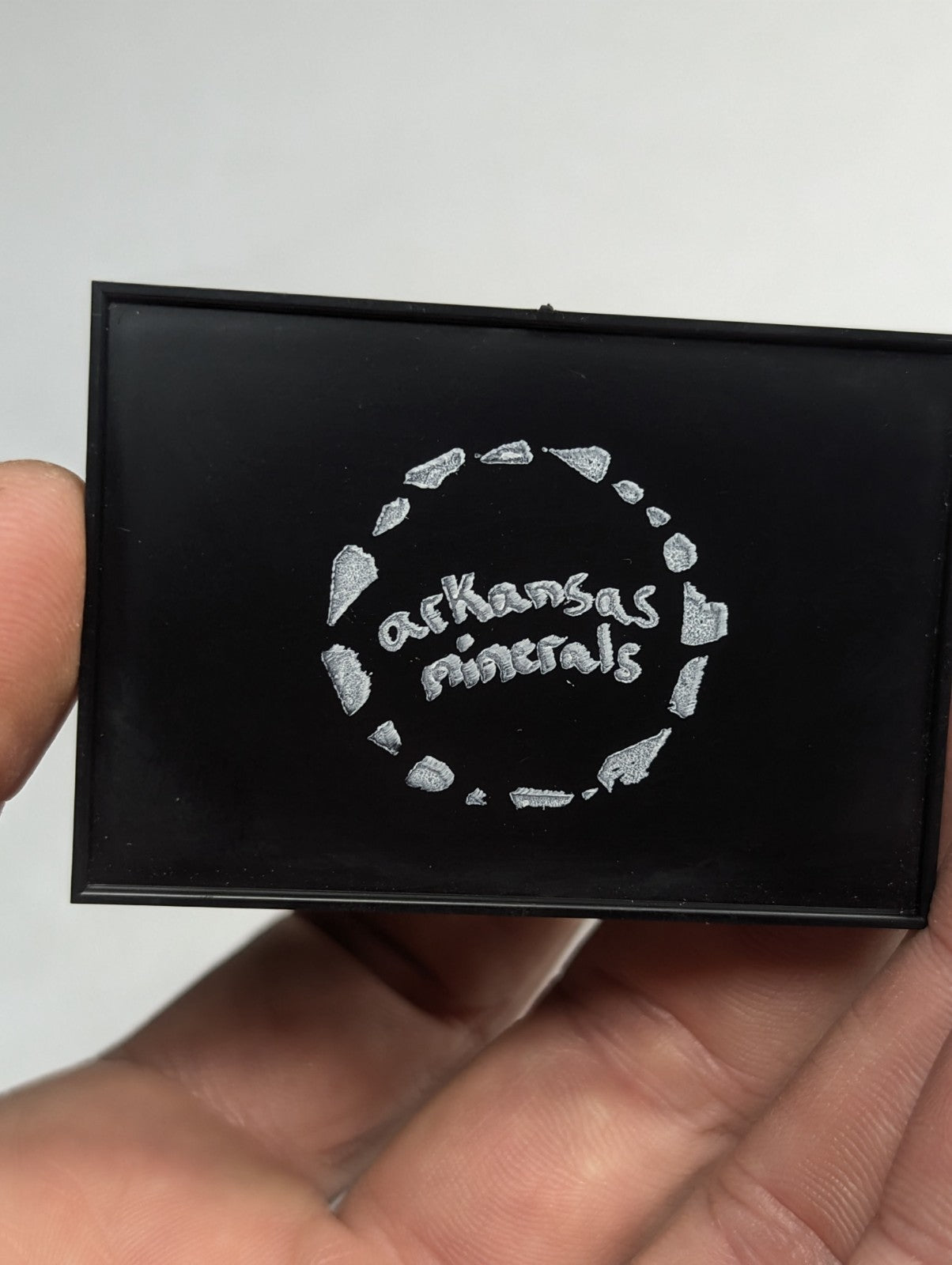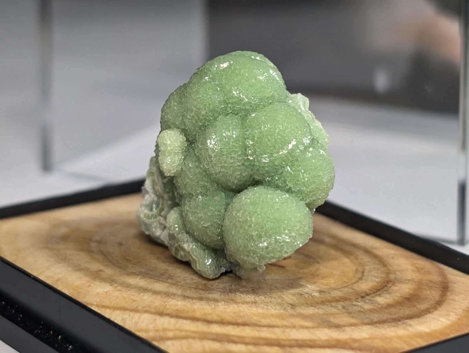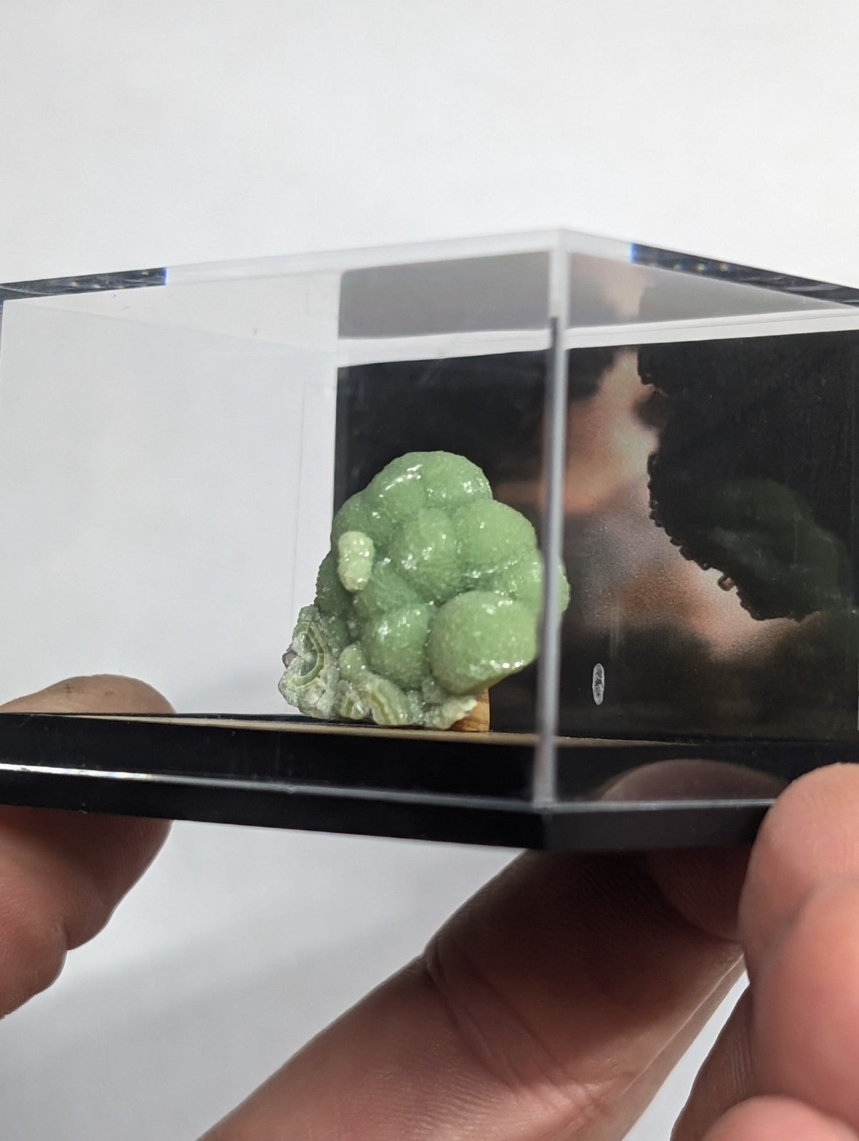 It is mounted in our new boxes we designed and made utilizing a naturally UV reactive Pine knot wood that comes from our land in Arkansas. The back is a photographic print of one of our photos showing an example of the inside of a "vug" of Wavellite from Arkansas (like a crystal cave of sorts). These are unique and exclusive to our shop.