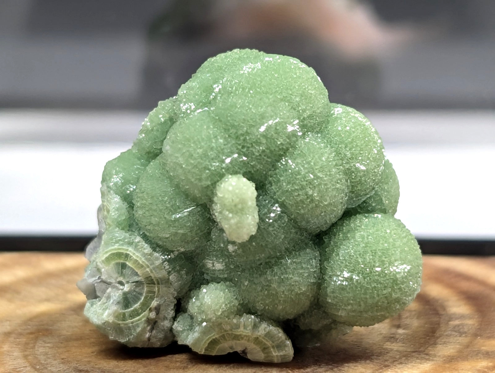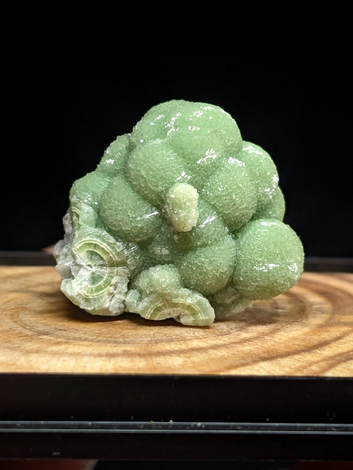 Absolutely phenomenal green Wavellite w/ excellent crystallization, great aesthetics and overall amazing quality. From our personal collection of "best of Arkansas Minerals". It has a small custom hand carved and polished prop mount attached to the base (made of the same type of wood as the base) so that it can display in the most fantastic way possible.