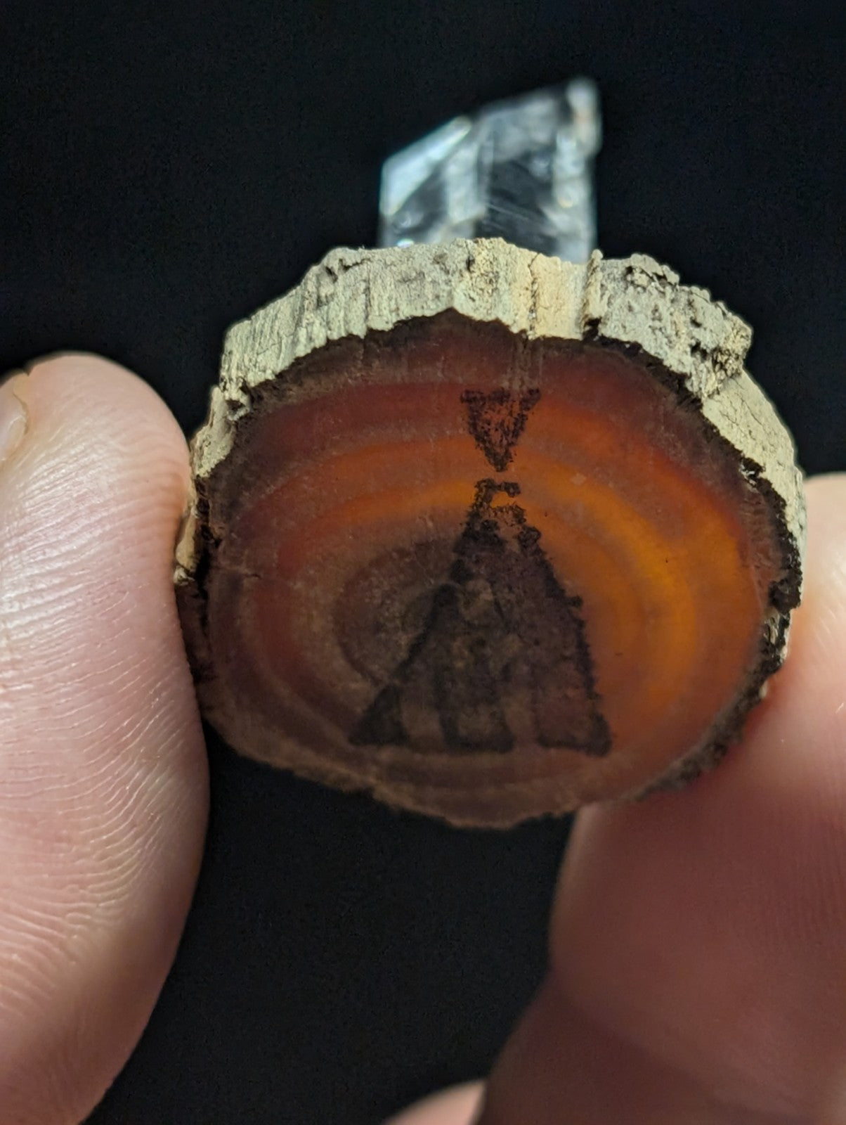 A very nice Quartz Crystal point w/ excellent optical clarity. It hosts a few small inclusions of Adularia, and the back of the main prism body is uniquely etched where more Adularia was once attached but likely dissolved off of the piece while underground (due to acidic changes and other changing conditions in its growth environment). Very neat and unique aesthetics here.The point comes mounted with ticky tacky on a naturally uv-reactive pine knot wood base that also illuminates nicely when light shines through it. The wood itself is naturally infused with the resin of the tree it came from, so it smells wonderful too, like the Arkansas forests from where it was unearthed.