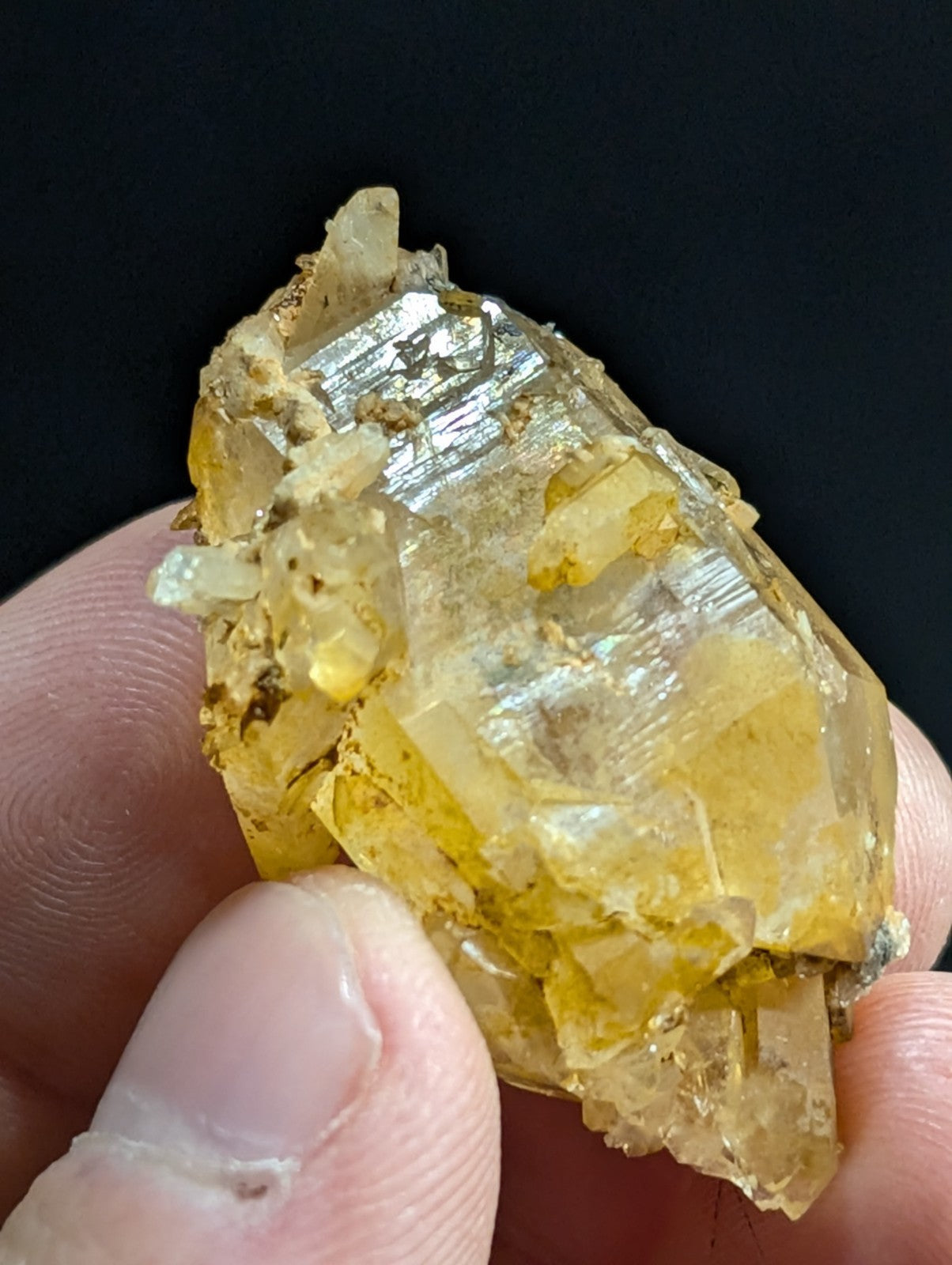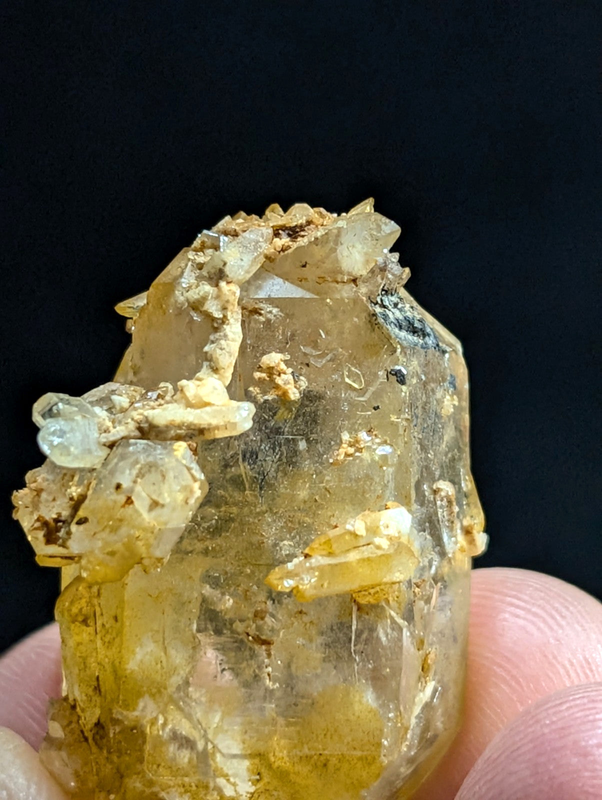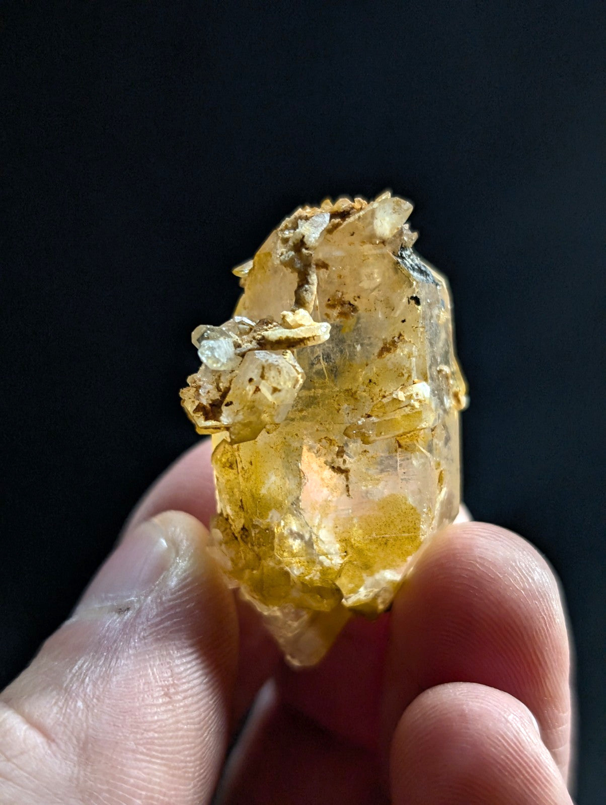 Old stock Double Terminated Quartz Crystal point w/ beautiful form, natural color and with Adularia attached to several portions of the quartz body. Some of the Adularia is at least partially included. Interesting rehealed formations on the quartz as well as beautiful secondary growth. It is from Jimmy Colemans Quarry at Miller Mountain.