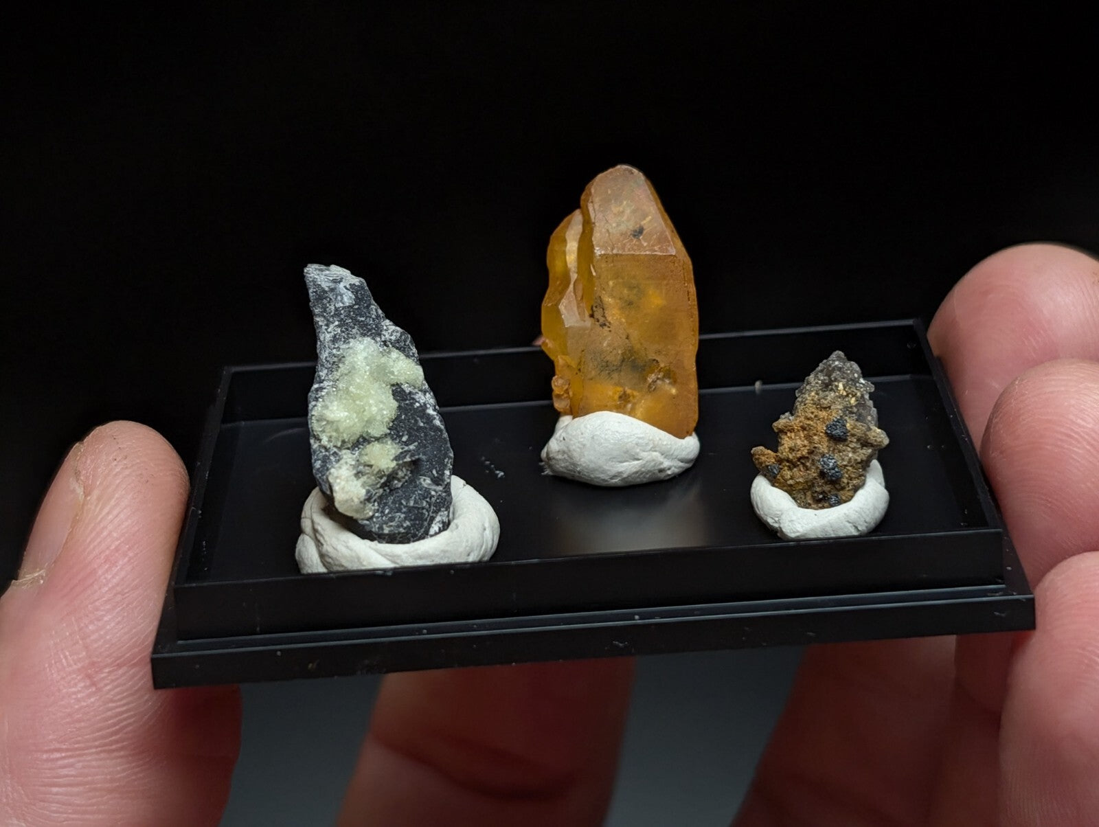 x1 three-specimen acrylic display case that hosts x1 wavellite, x1 quartz, and x1 brookite and smoky quartz combo (montgomery county, garland county, hot spring county)