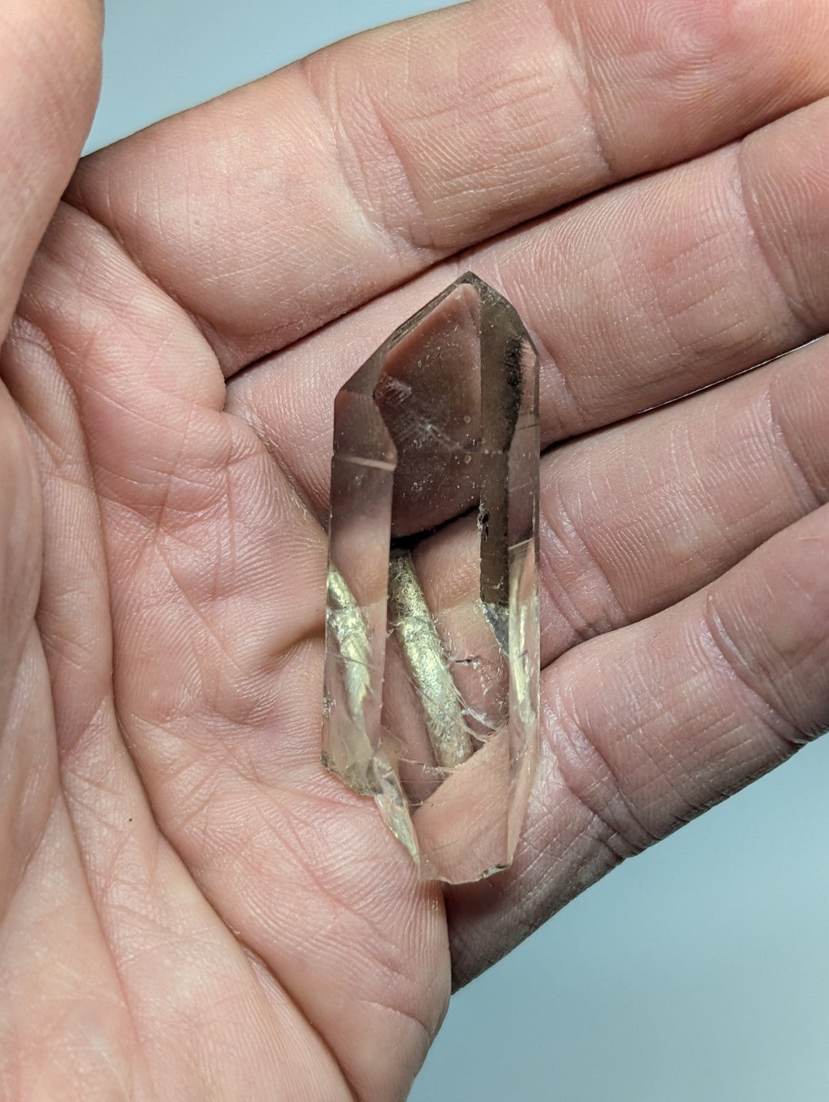 Phenomenal clear and lighter-hued Smoky Quartz Crystal Point with very unique inclusions under some of the main faces . From Garland County, Arkansas. old stock. The smoky hue is very light and best seen when held against a white background. The specimens that came from this unique find exhibited varying hues of Smoky, from very light to lighter brown hues with great clarity. They also featured these very peculiar "inclusions" under the main faces on most of the specimens. This is a wonderful example from this old stock find.