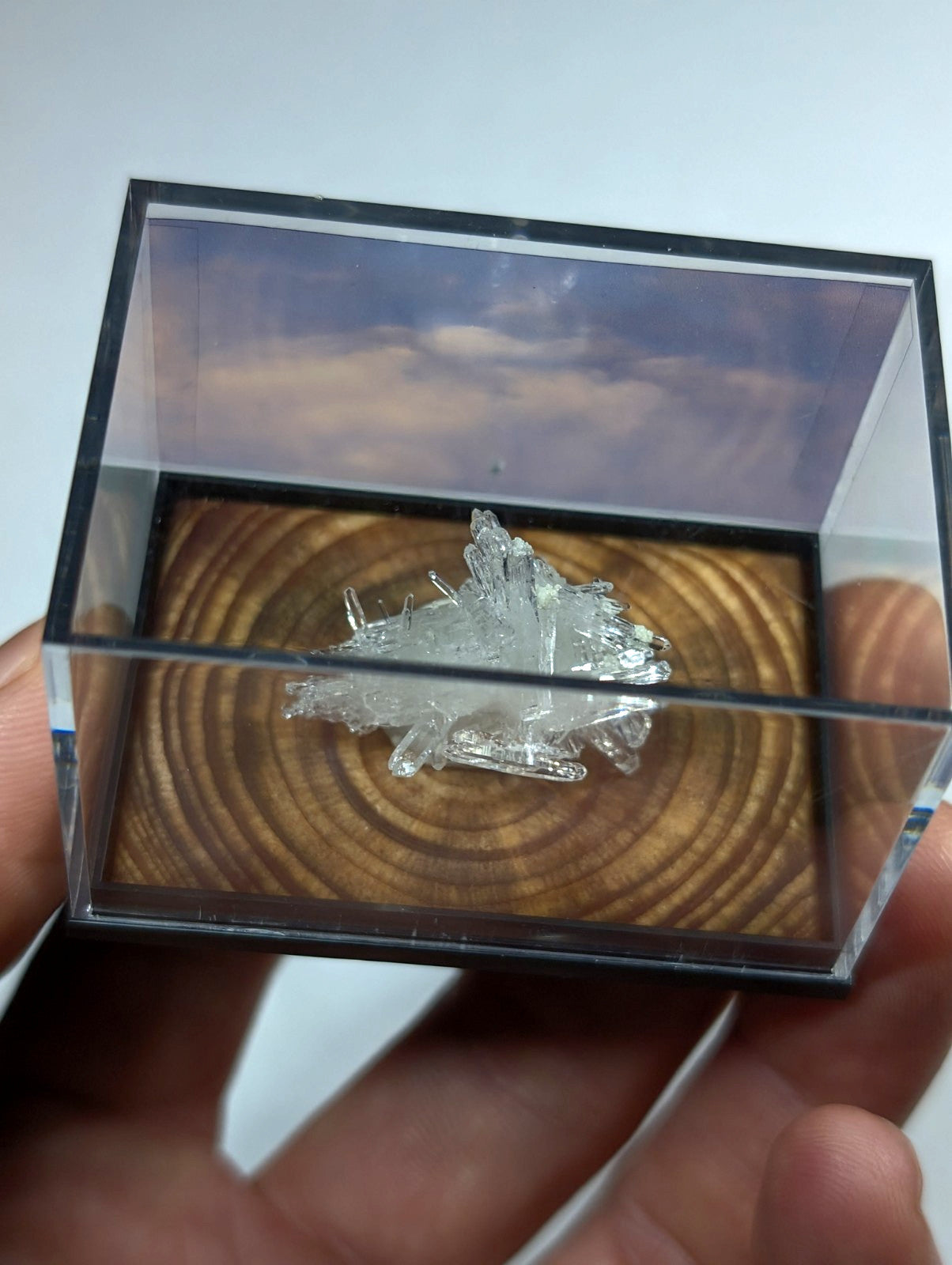 It is mounted in our new boxes we designed and made utilizing a naturally UV reactive Pine knot wood that comes from our land in Arkansas. The back is a transparent photographic print of one of our photos of the sunset over the Ouachita mountain range in Arkansas. These are unique and exclusive to our shop.