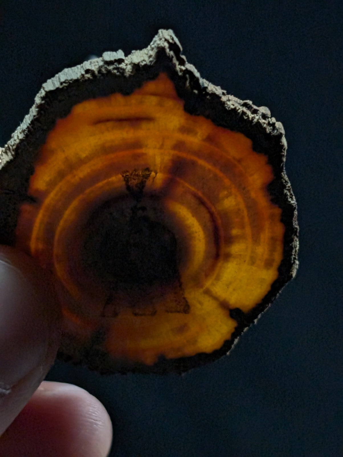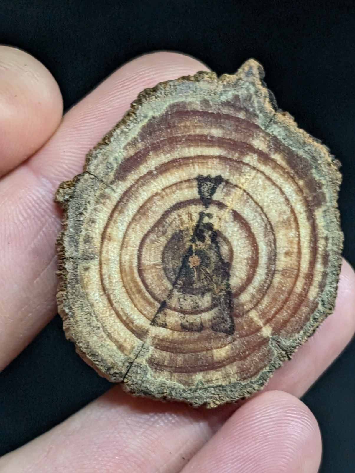 Old stock Tabular Twin Quartz Crystal point w/ beautiful form. The prism body is slightly curved, which has created milky inclusions. Cool aesthetics and displays nicely. The point comes mounted with ticky tacky on a naturally uv-reactive pine knot wood base that also illuminates nicely when light shines through it. The wood itself is naturally infused with the resin of the tree it came from, so it smells wonderful too, like the Arkansas forests from where it was unearthed.