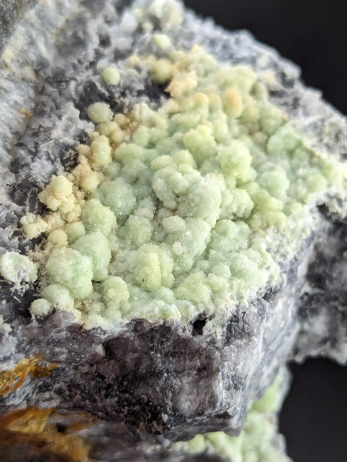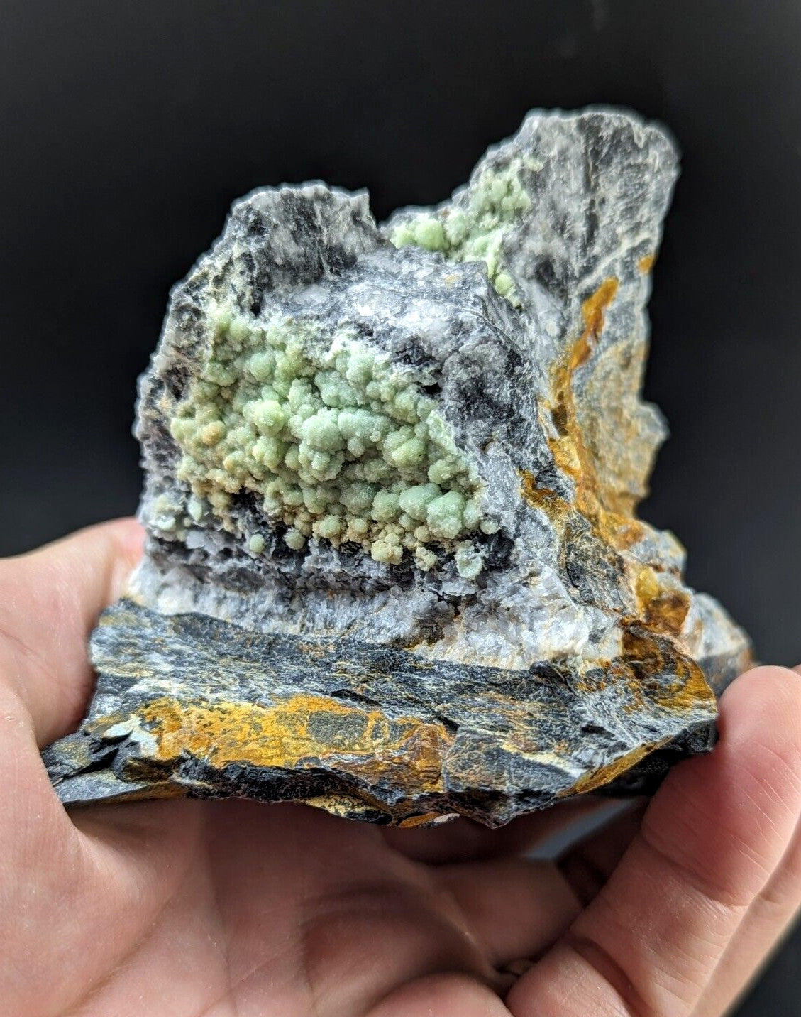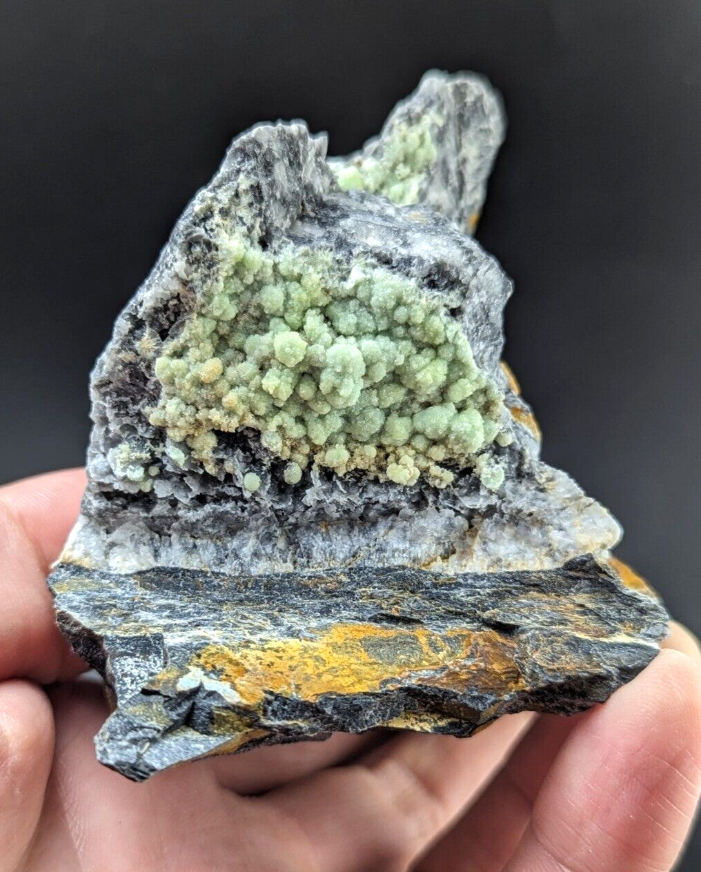 This seam material was tested and considered to be Fluorwavellite w/ SiO2 intermixed based on its chemistry. Very Unique/Rare hues. Great example for any collection. Amazing crystallization (see photos). There is some Grey crystallized quartz on the piece as well. Super awesome display aesthetics! One of a kind!