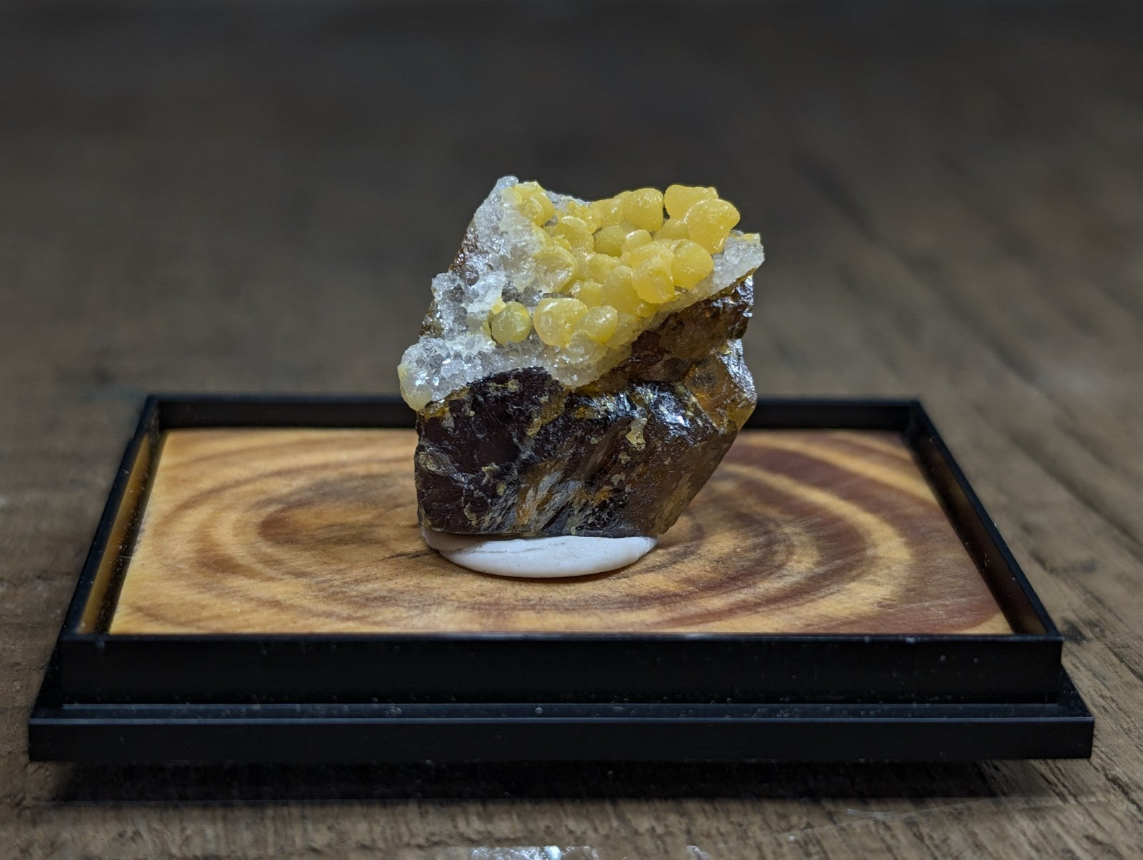 Extremely Rare old stock Greenockite included Smithsonite on Sphalerite, Rush Mining District, Marion Co, Arkansas. Flourescent in Longwave/ UV Reactive. Old stock, and one of the rarest finds in Arkansas, closed locale in Marion County, Arkansas in the Rush Creek Mining District. Mined in the 1970s.