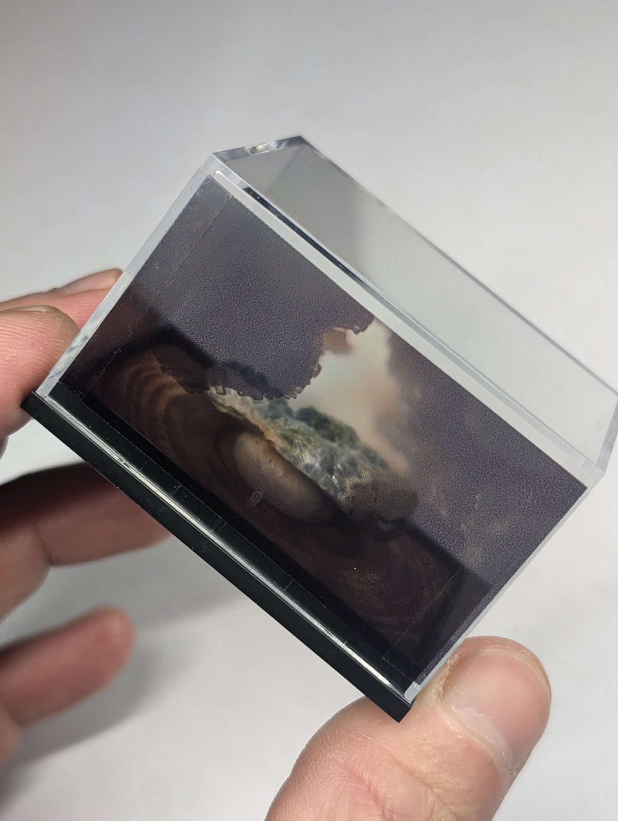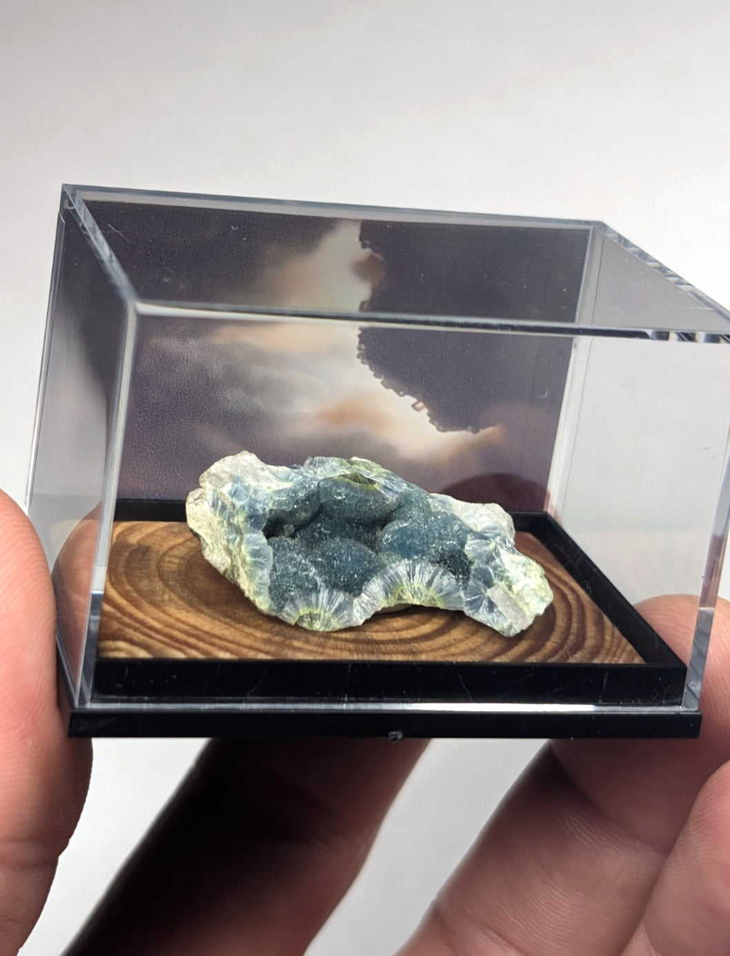 It is mounted in our new boxes we designed and made by hand utilizing a naturally UV reactive Pine knot wood that comes from our land in Arkansas. The back is a transparent photographic print of one of our photos of the inside of a wavellite "vug" (looks sort of like a micro wavellite cave). These are unique and exclusive to our shop.