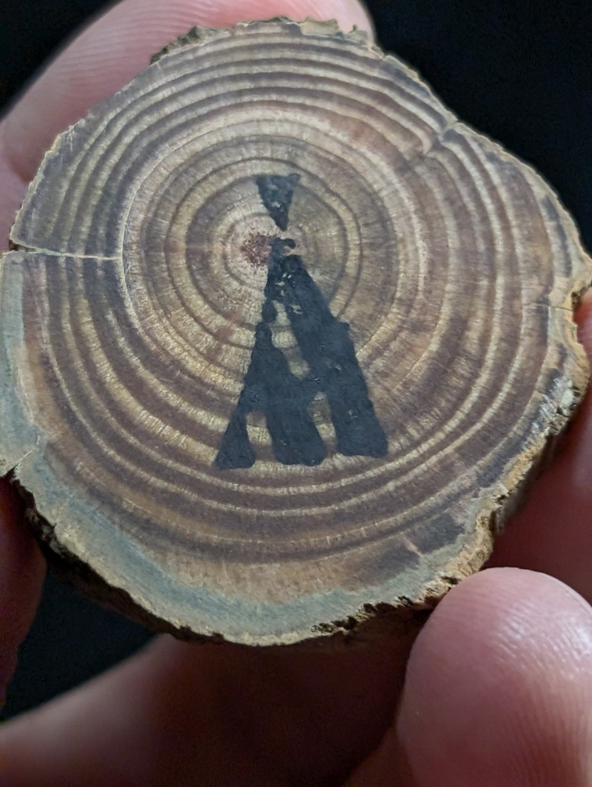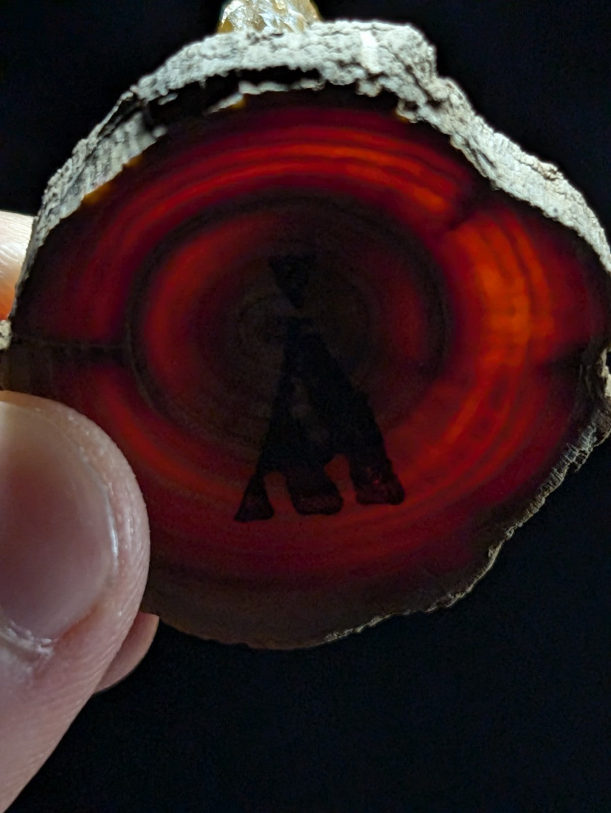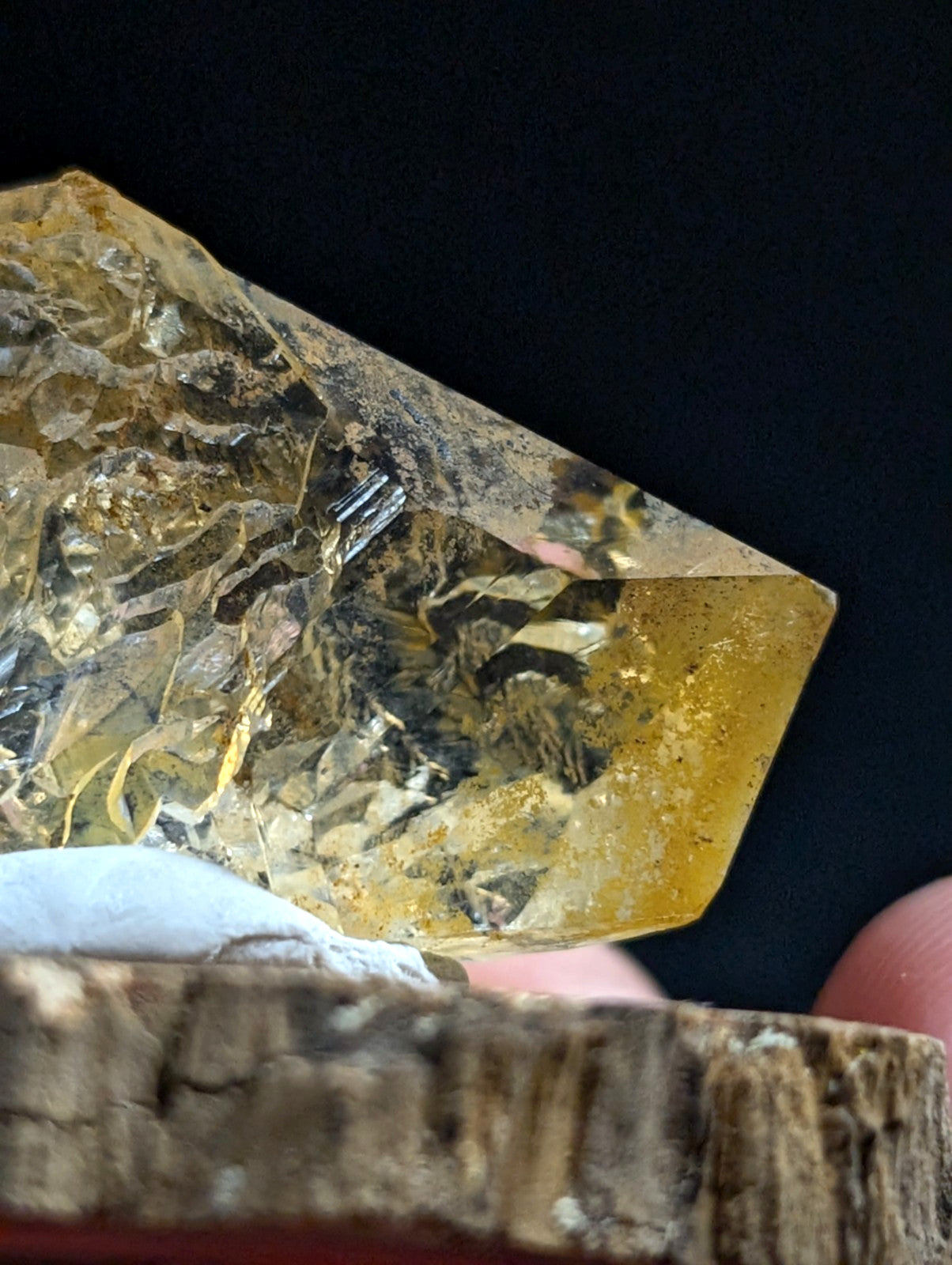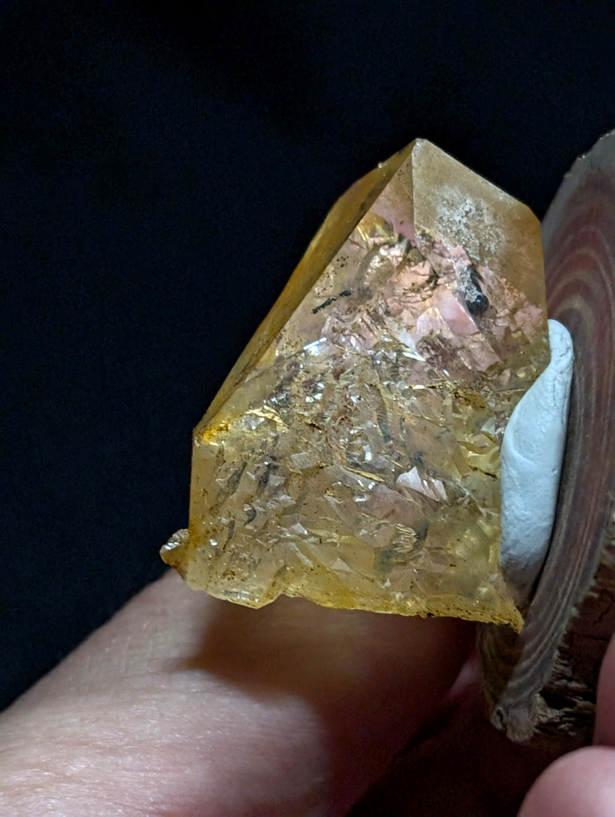 The point comes mounted with ticky tacky on a naturally uv-reactive pine knot wood base that also illuminates nicely when light shines through it. The wood itself is naturally infused with the resin of the tree it came from, so it smells wonderful too, like the Arkansas forests from where it was unearthed.