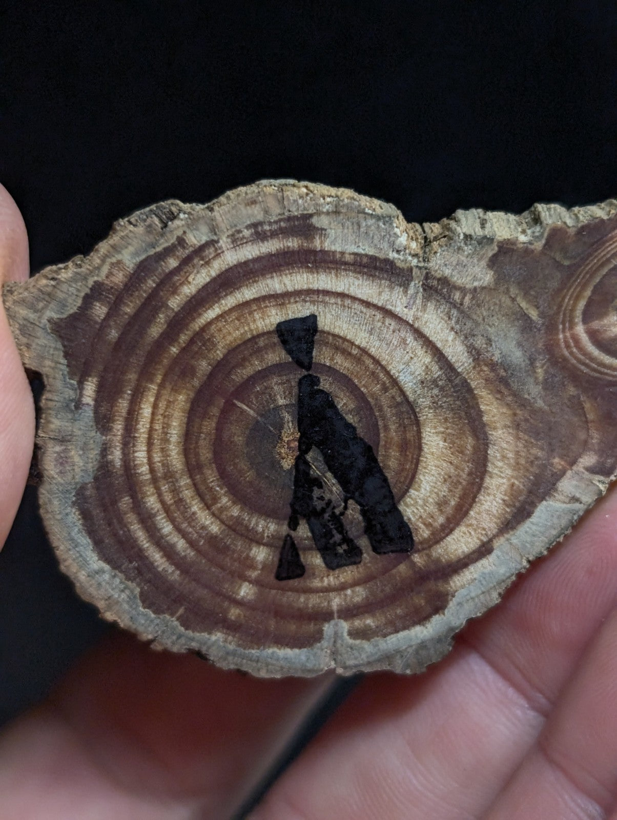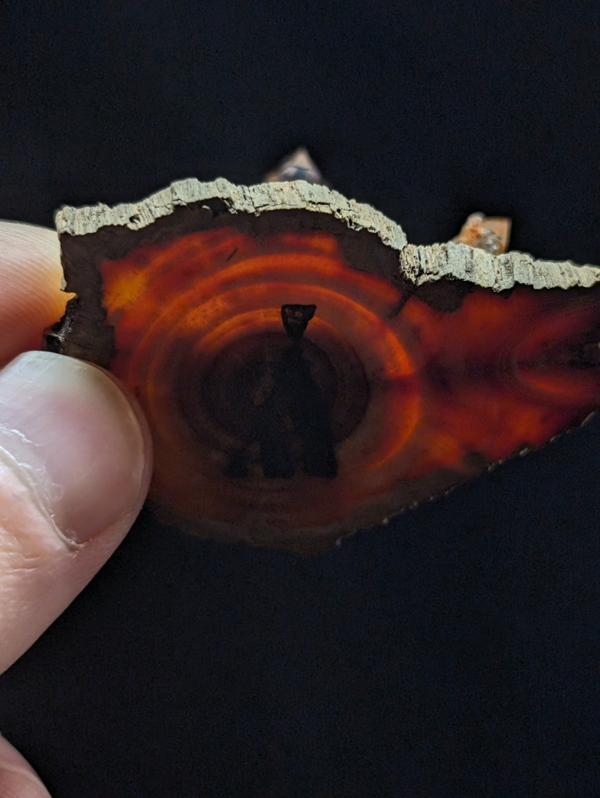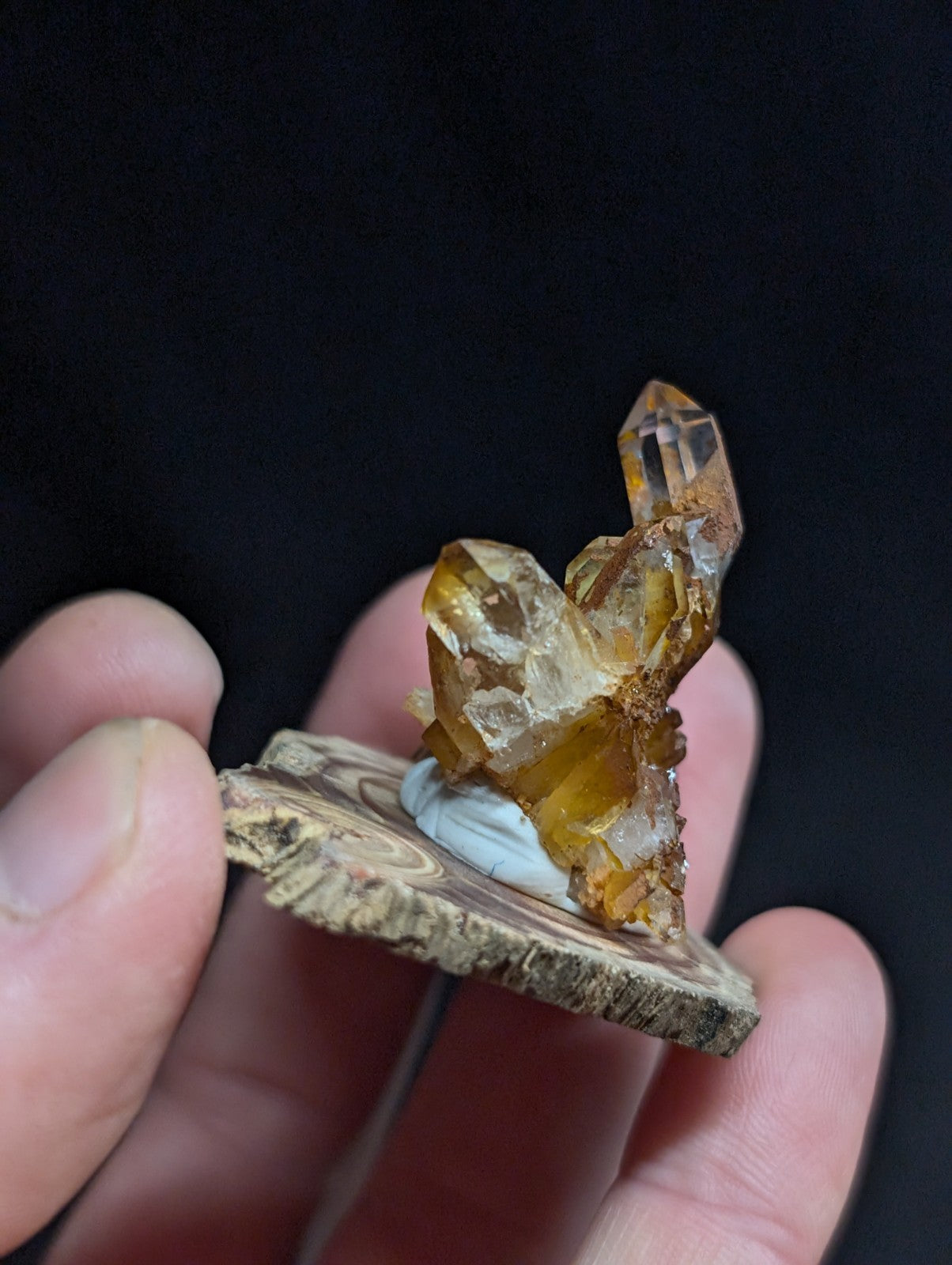 The specimen comes mounted with ticky tacky on a naturally uv-reactive pine knot wood base that also illuminates nicely when light shines through it. The wood itself is naturally infused with the resin of the tree it came from, so it smells wonderful too, like the Arkansas forests from where it was unearthed.