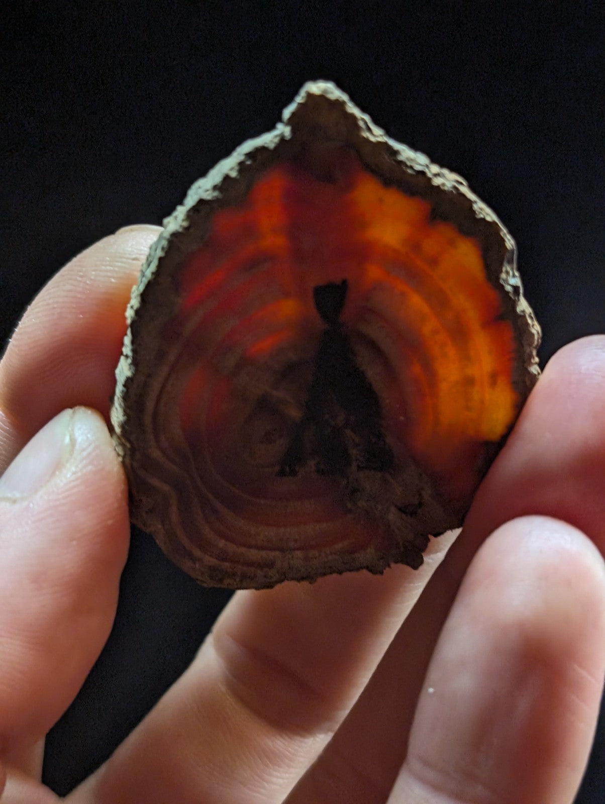 The specimen comes mounted with ticky tacky on a naturally uv-reactive pine knot wood base that also illuminates nicely when light shines through it. The wood itself is naturally infused with the resin of the tree it came from, so it smells wonderful too, like the Arkansas forests from where it was unearthed.