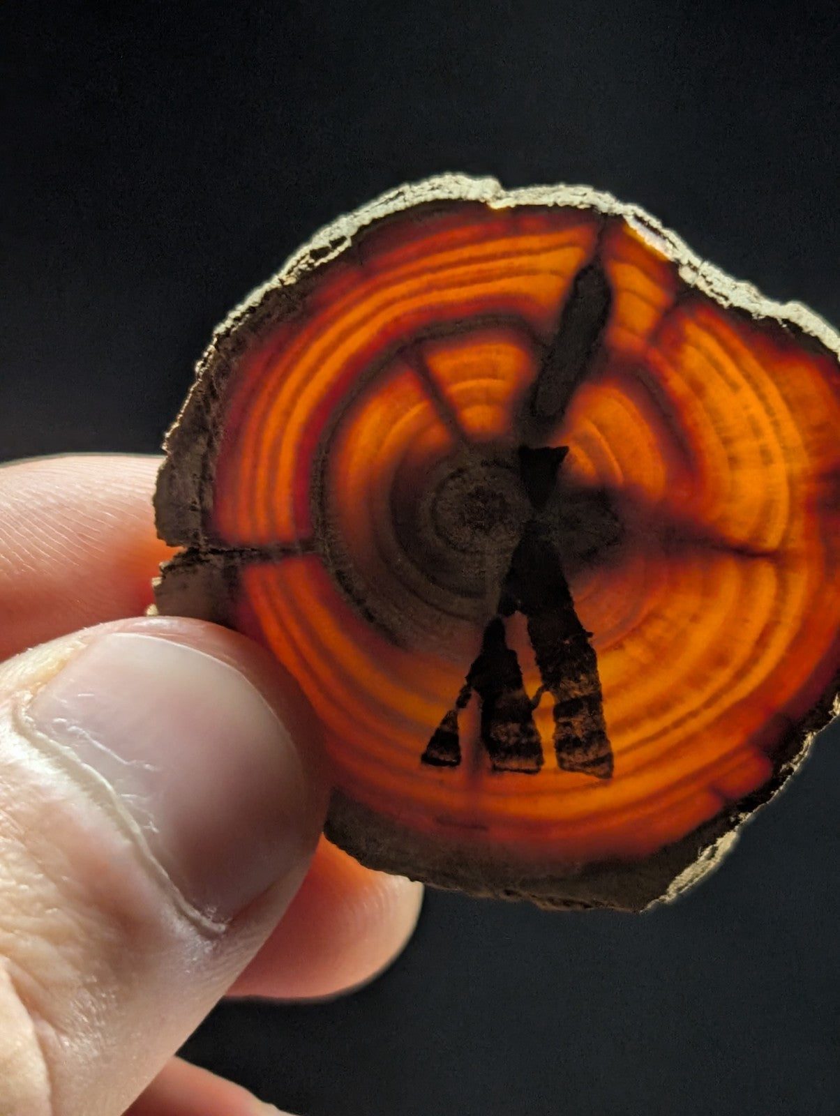 Beautiful and unique specimen with very interesting form and naturally occurring Rainbow iridescence. Great aesthetics overall. The point comes mounted with ticky tacky on a naturally uv-reactive pine knot wood base that also illuminates nicely when light shines through it. The wood itself is naturally infused with the resin of the tree it came from, so it smells wonderful too, like the Arkansas forests from where it was unearthed.