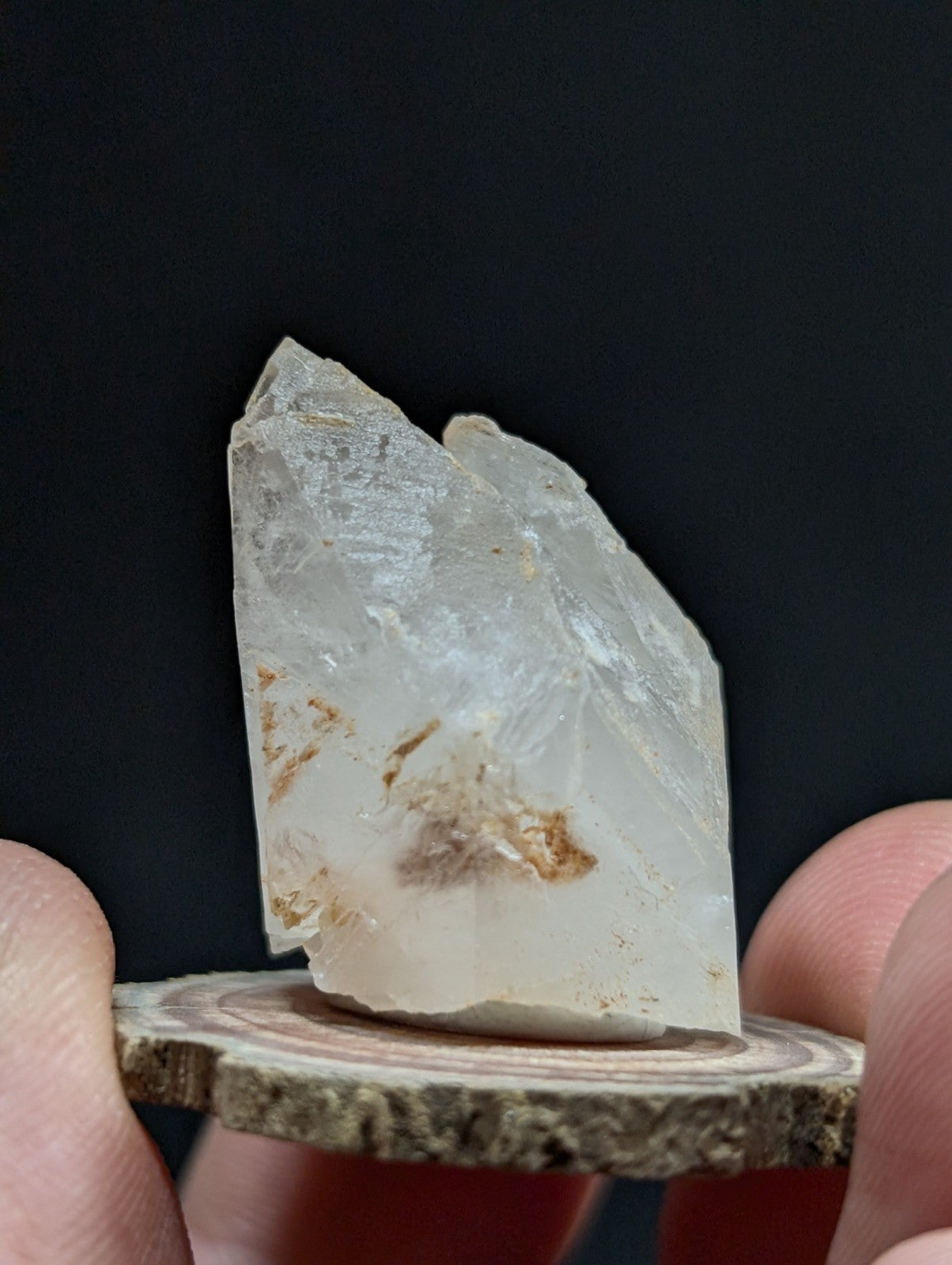 Unique Quartz Crystal Point, Old Stock, Montgomery County, Arkansas, w/ natural wood base.