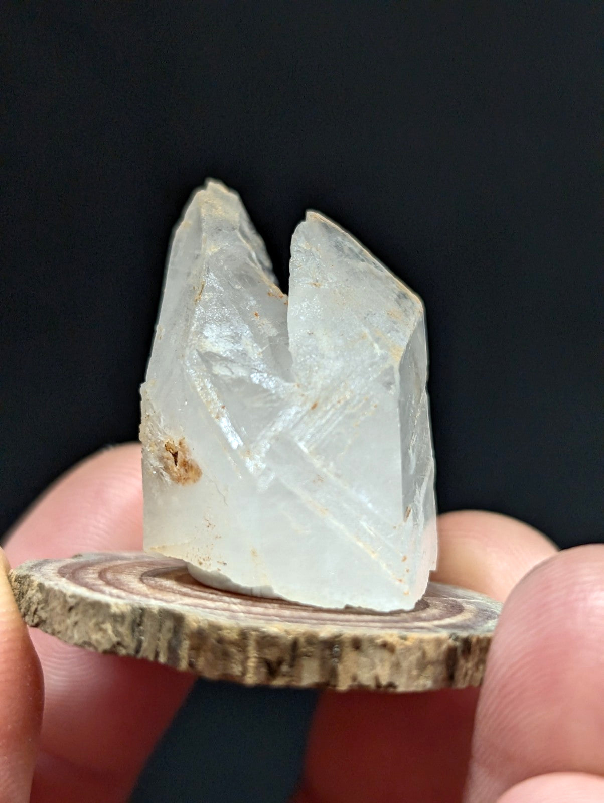 Old stock Quartz Crystal point w/ beautiful and unique form. This is a type of Growth interference quartz, which hosts a very interesting and deep "saw-mark-like" void where another mineral (likely calcite) was once attached. The calcite/other mineral dissolved while the crystal was still underground, likely due to various changes (temperature,changes in acidity etc) in the quartz seam environment over time. It also hosts a growth void in the prism body, making it resemble a crystal creature with an eye and a mouth. Very unique and top aesthetics for this growth type! From our personal collection of "best of unique small quartz crystals from Arkansas".