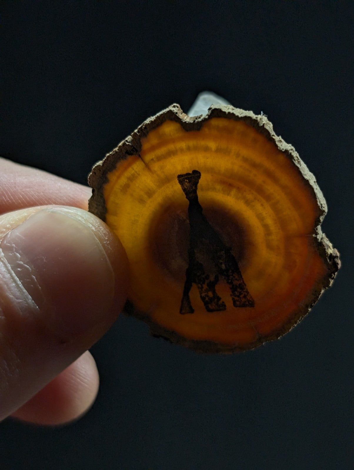 The point comes mounted with ticky tacky on a naturally uv-reactive pine knot wood base that also illuminates nicely when light shines through it. The wood itself is naturally infused with the resin of the tree it came from, so it smells wonderful too, like the Arkansas forests from where it was unearthed.