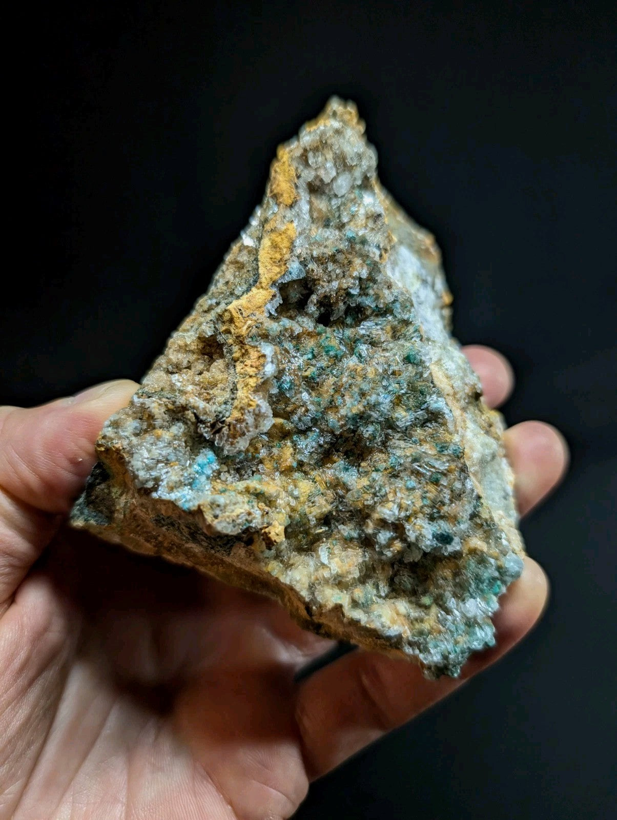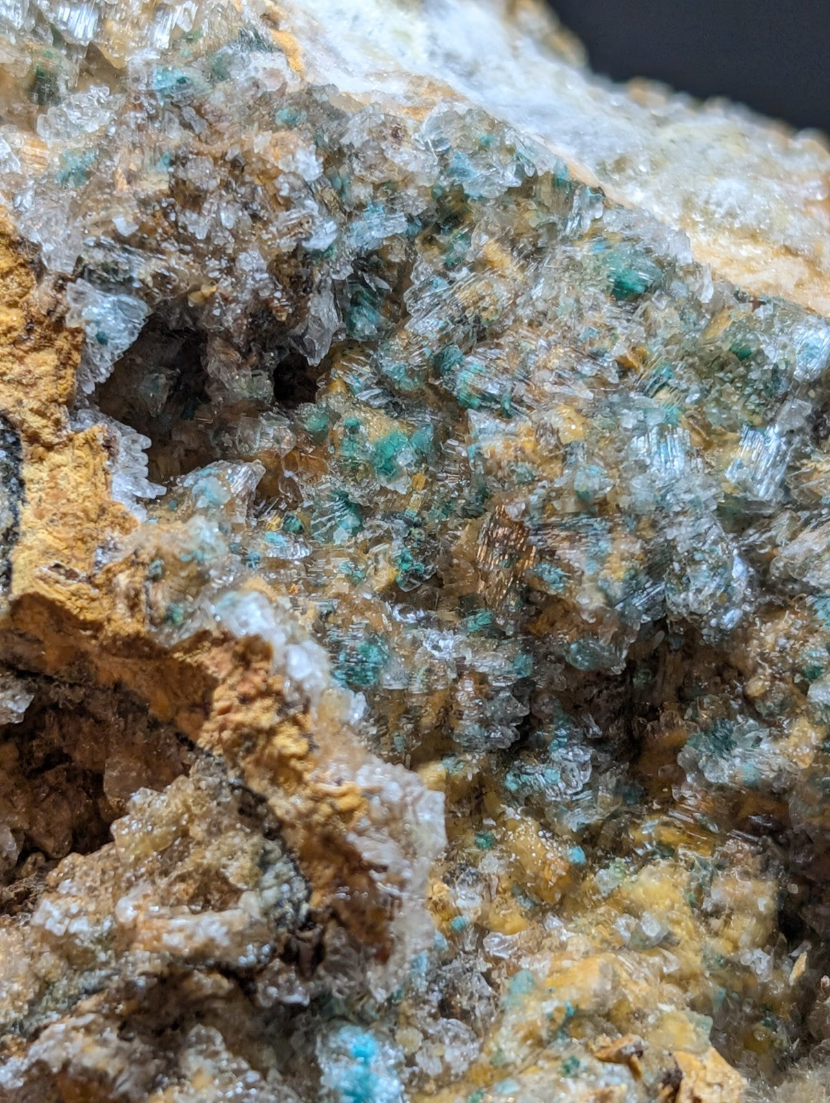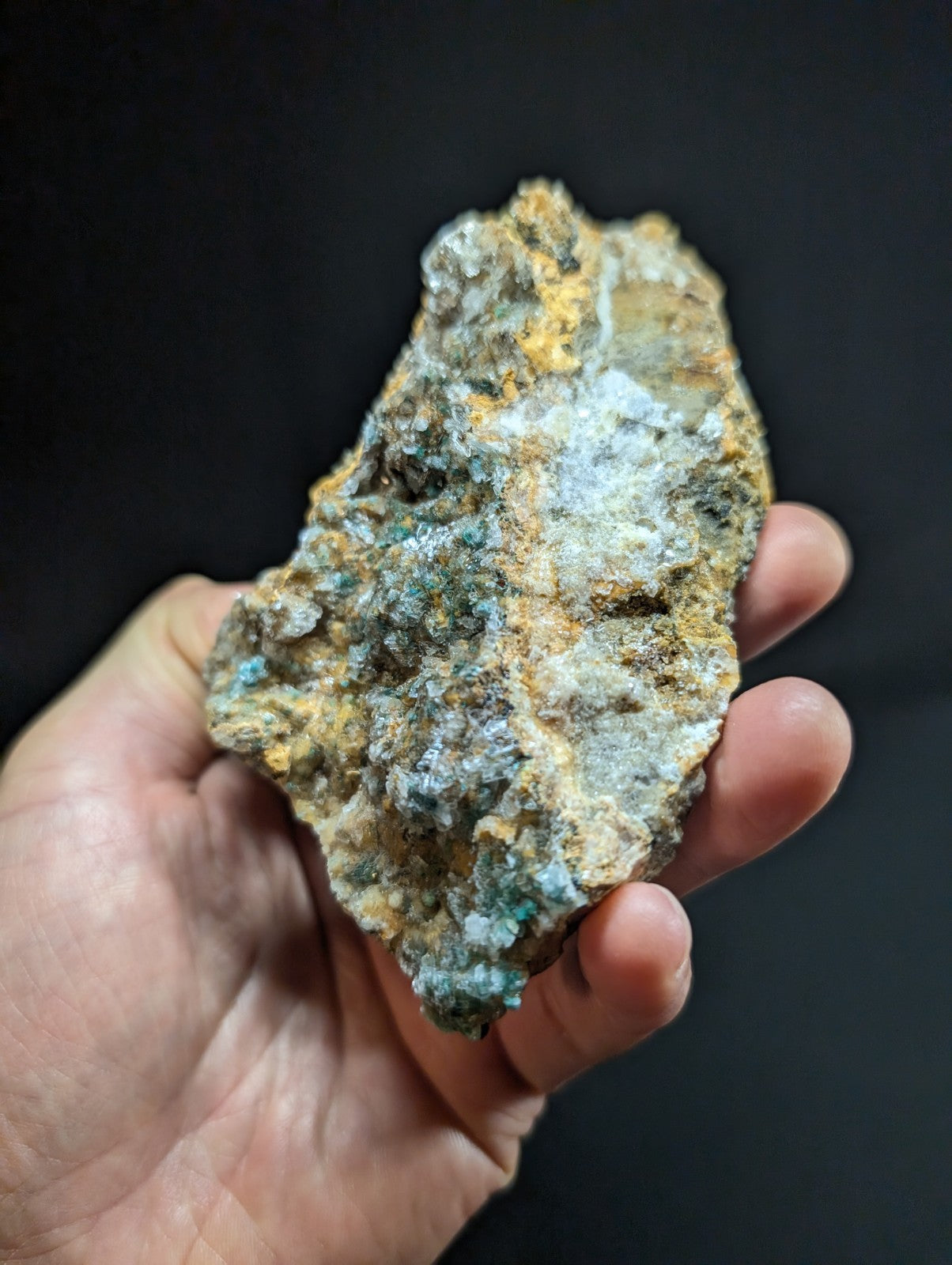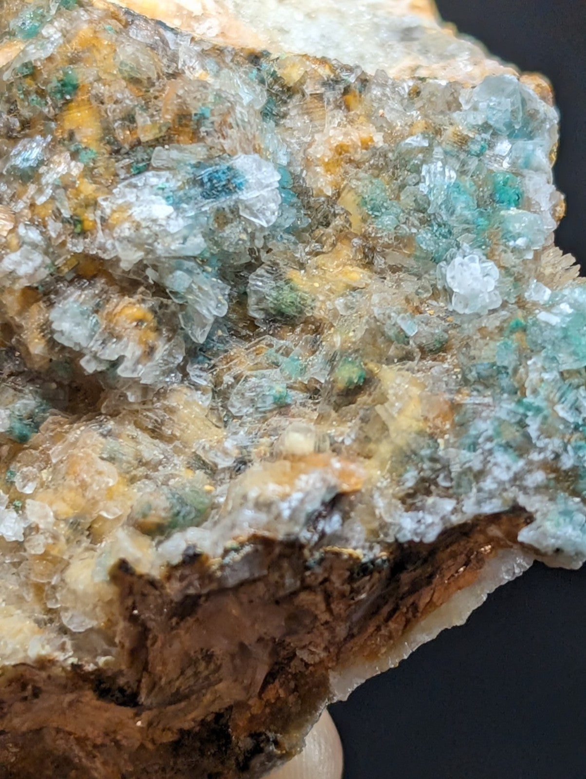 From an amazing old find of unusual combos of Blue-Green Aurichalchite, Green Malachite, and Selenite, etc on Dolomite. Extremely rare combo from the Rush mining district. This site has been long closed to collectors, and no more specimens will come from the area as it is now under National River status by the Federal Government (The Buffalo). Some of the aurichalcite is included within the Selenite. Super unique. From our personal collection.