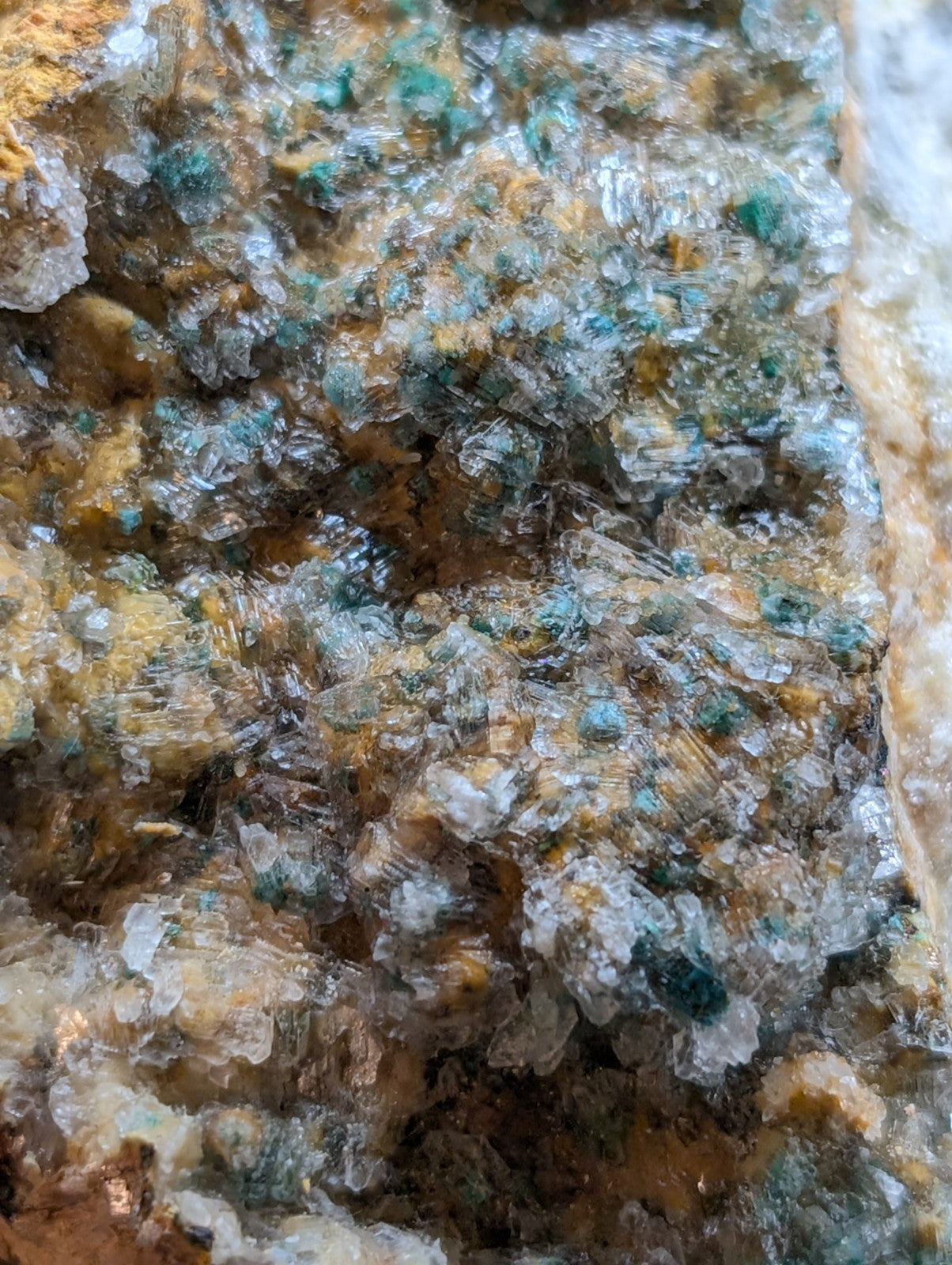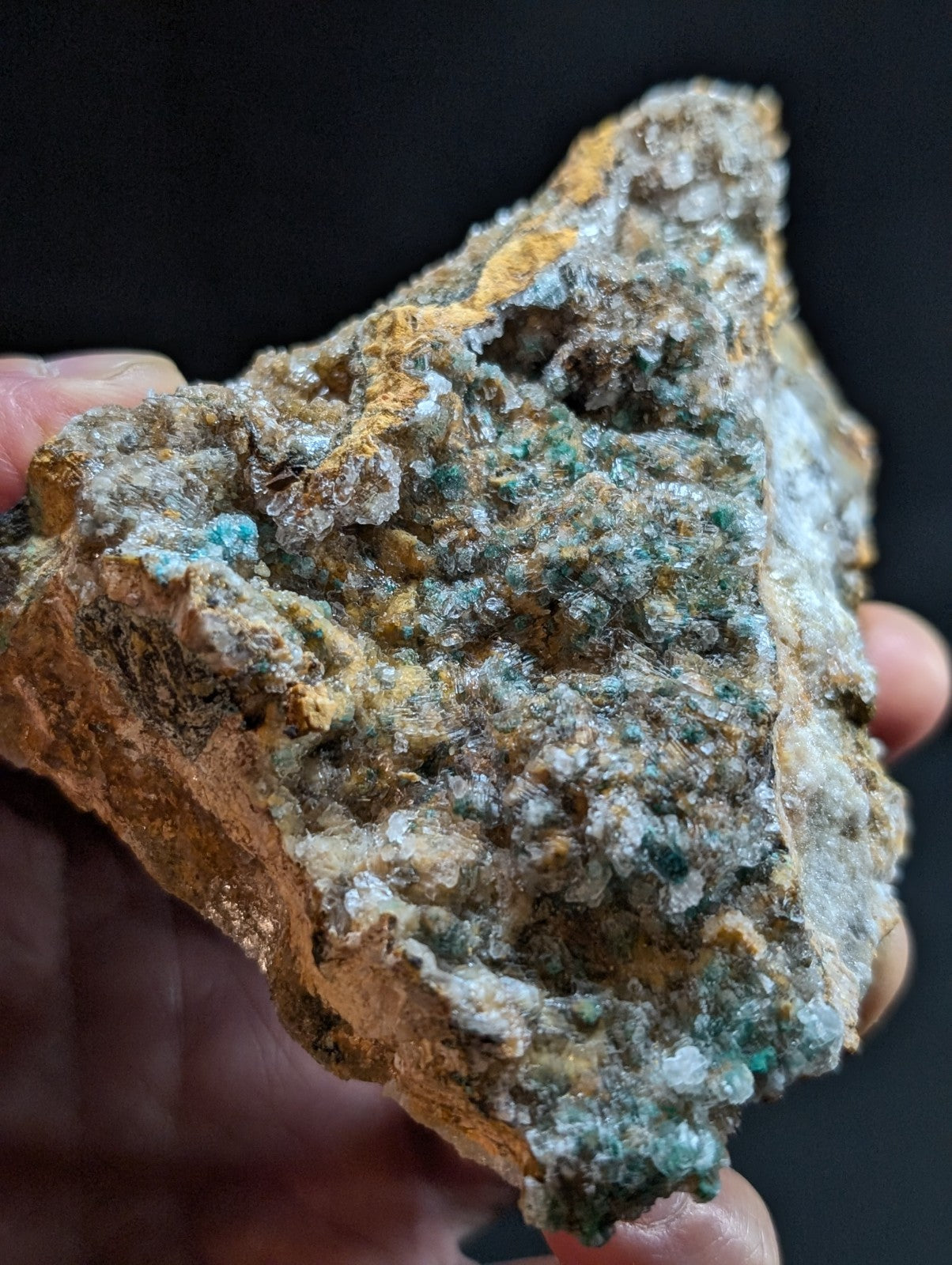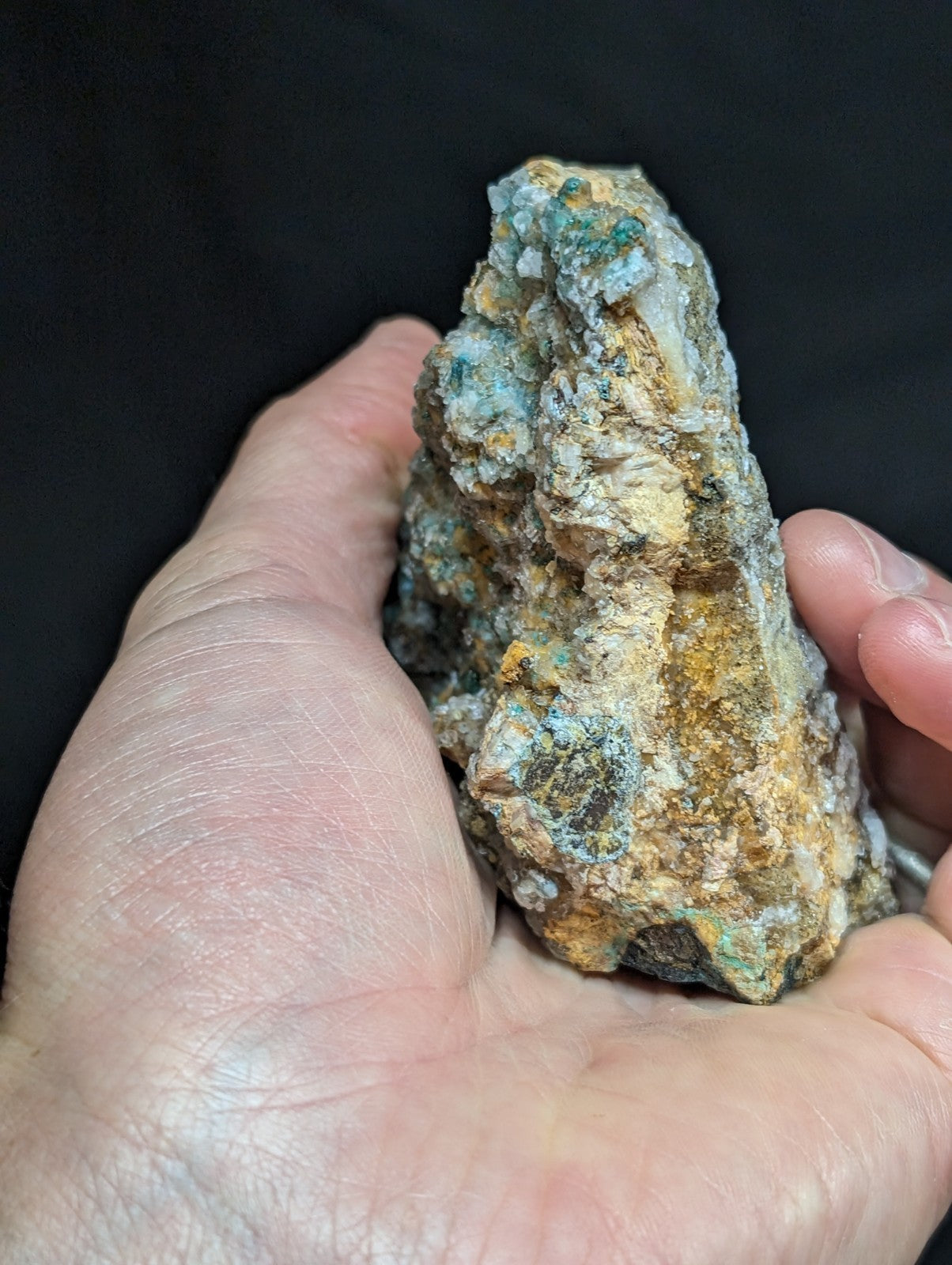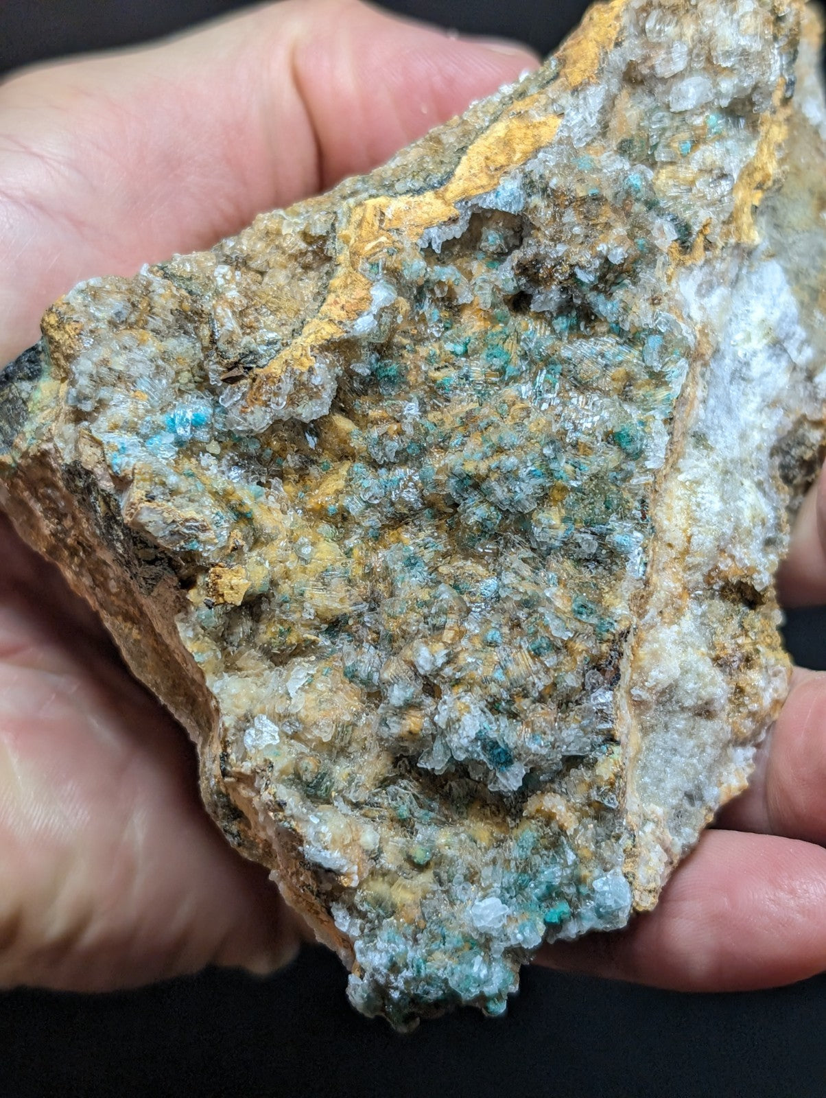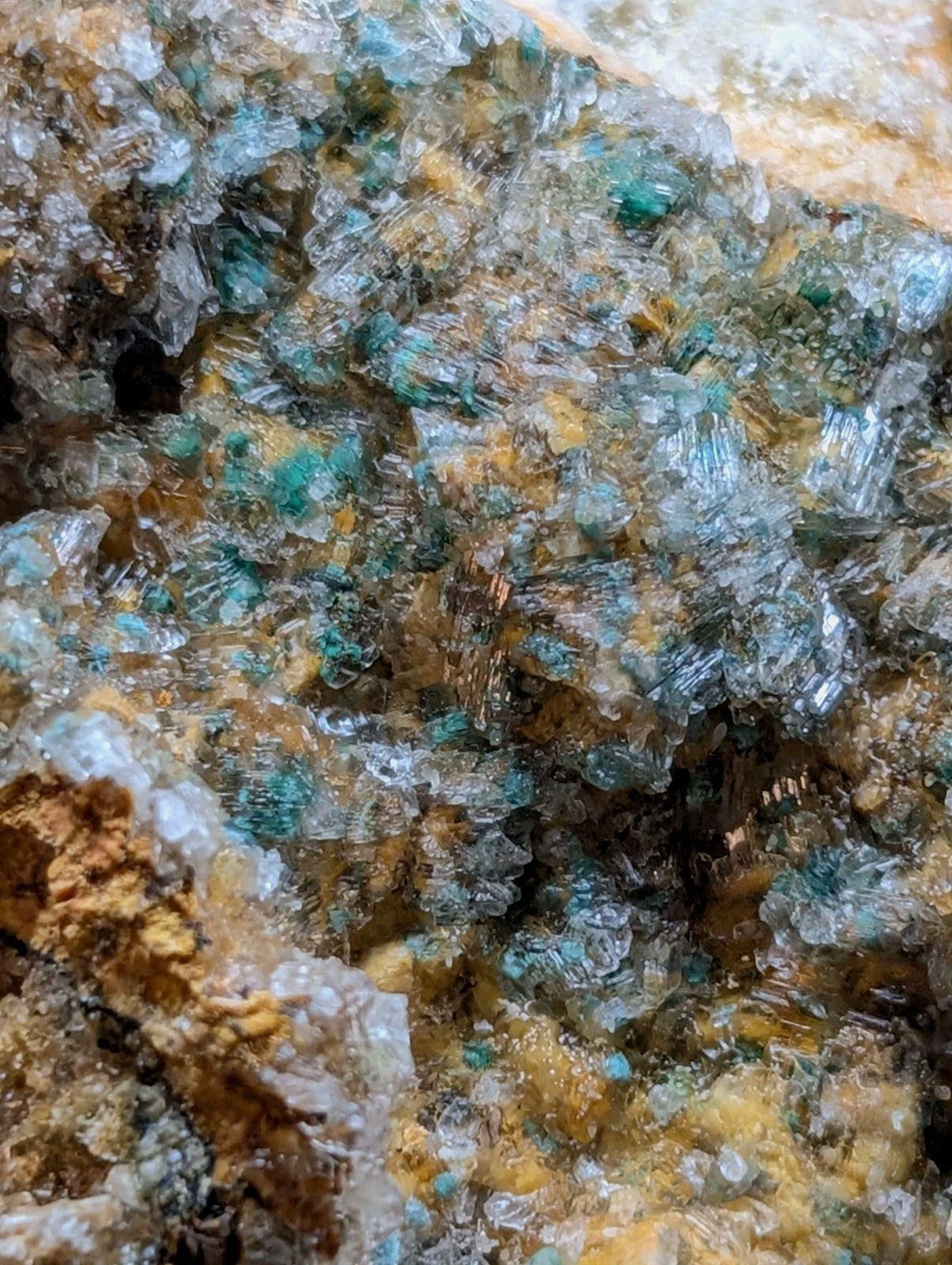 From an amazing old find of unusual combos of Blue-Green Aurichalchite, Green Malachite, and Selenite, etc on Dolomite. Extremely rare combo from the Rush mining district. This site has been long closed to collectors, and no more specimens will come from the area as it is now under National River status by the Federal Government (The Buffalo). Some of the aurichalcite is included within the Selenite. Super unique. From our personal collection.