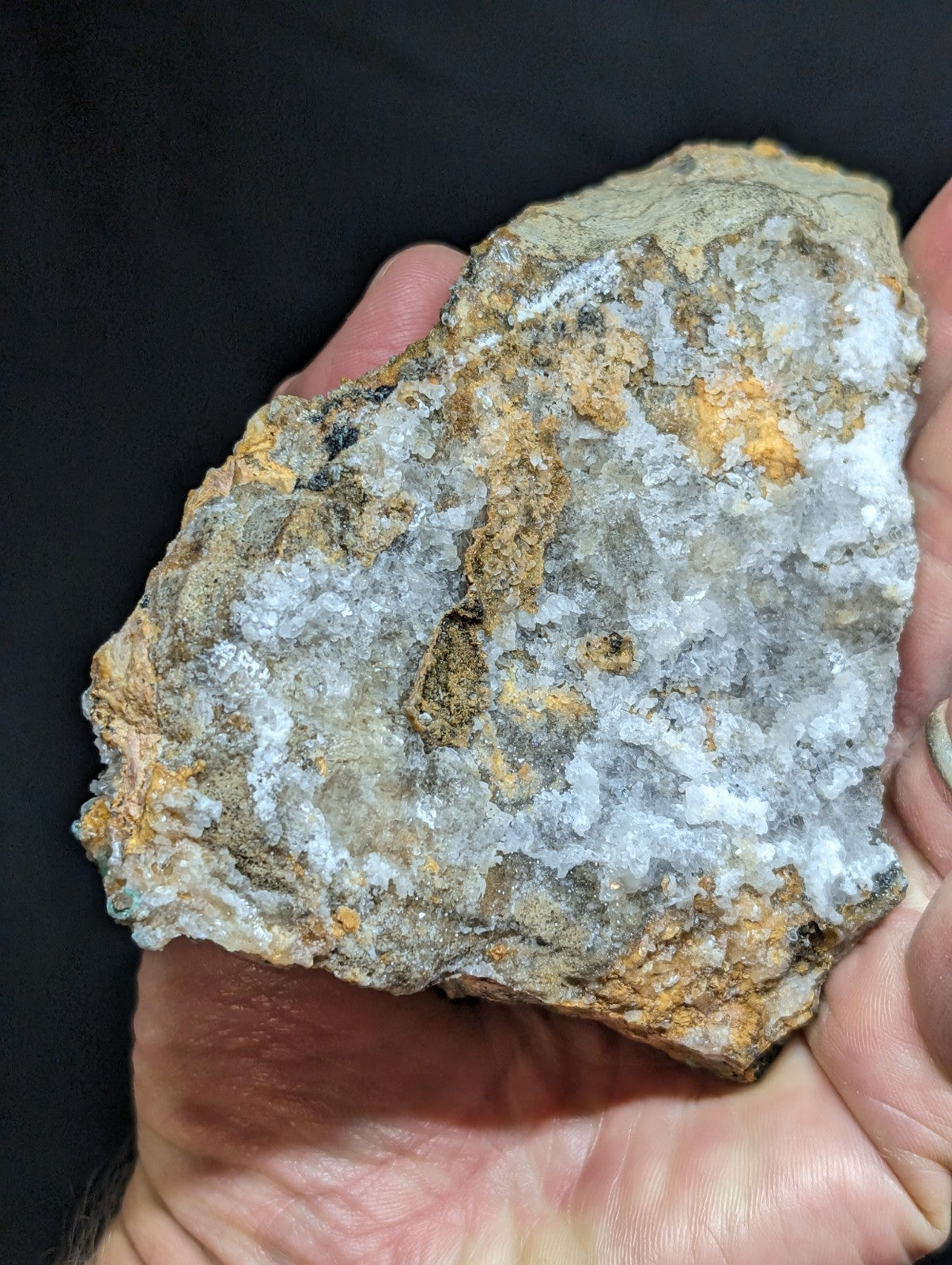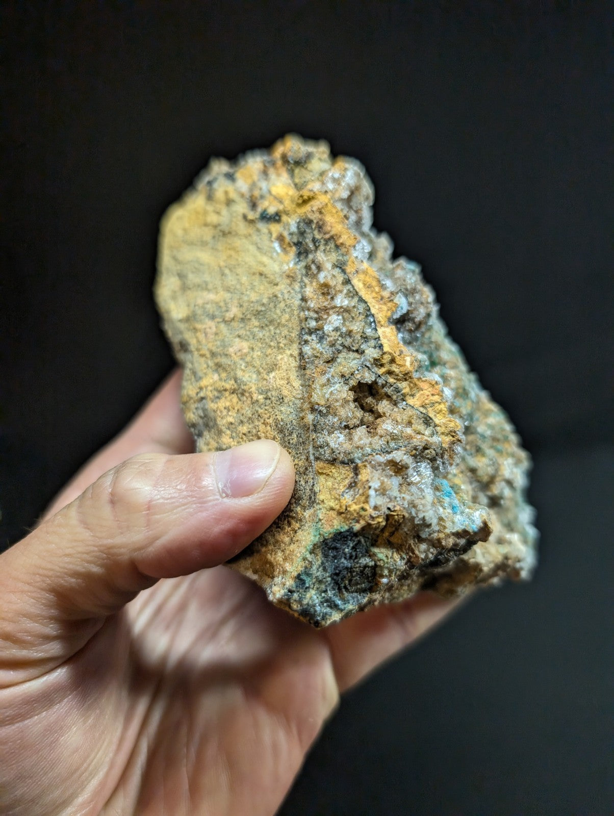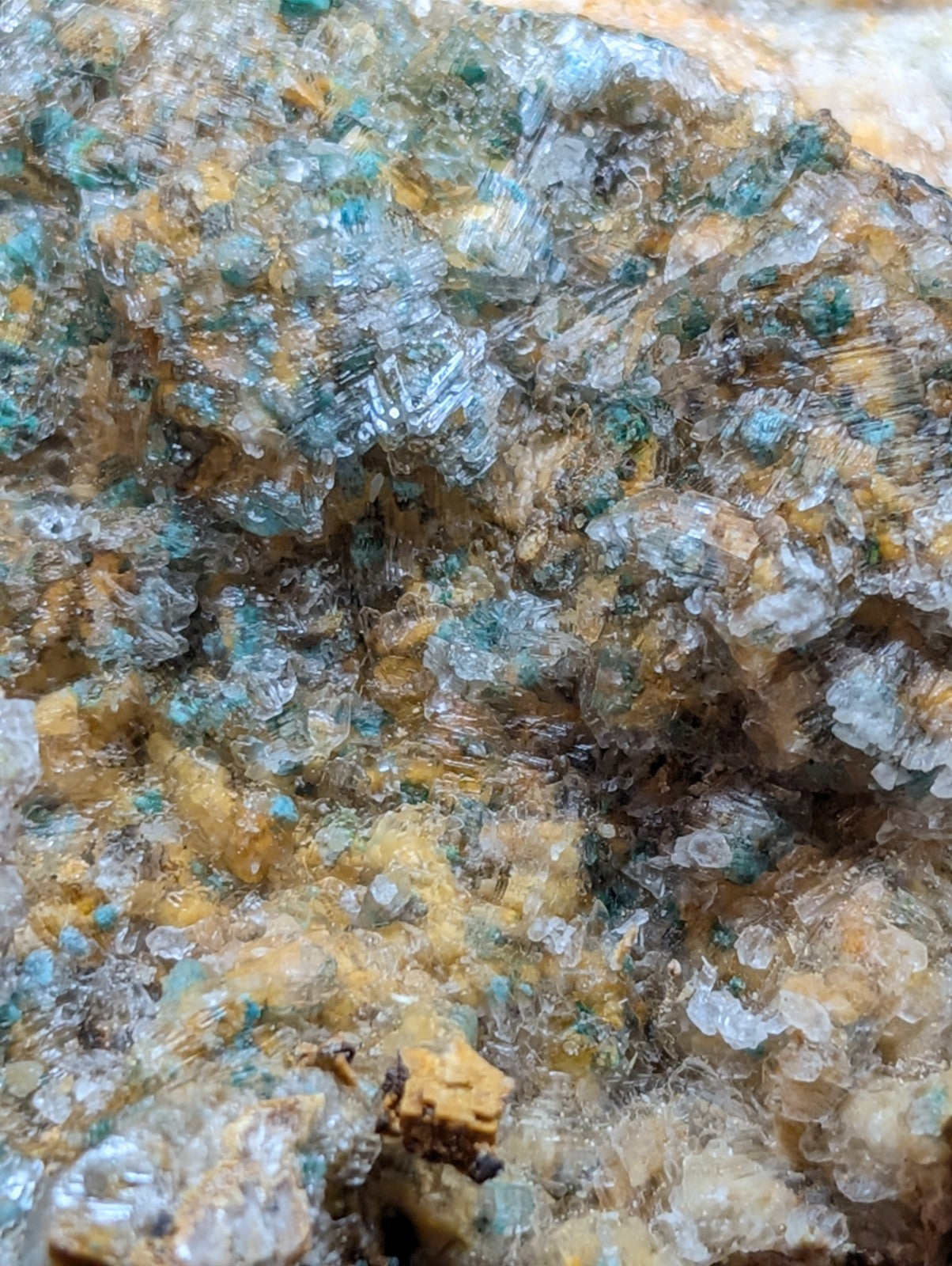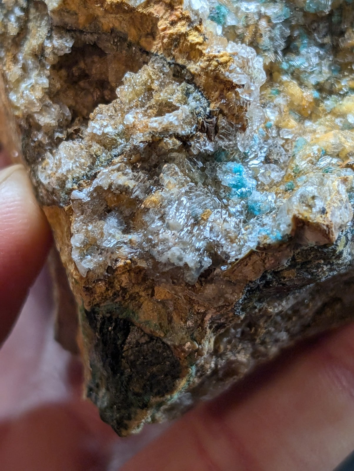 From an amazing old find of unusual combos of Blue-Green Aurichalchite, Green Malachite, and Selenite, etc on Dolomite. Extremely rare combo from the Rush mining district. This site has been long closed to collectors, and no more specimens will come from the area as it is now under National River status by the Federal Government (The Buffalo). Some of the aurichalcite is included within the Selenite. Super unique. From our personal collection.