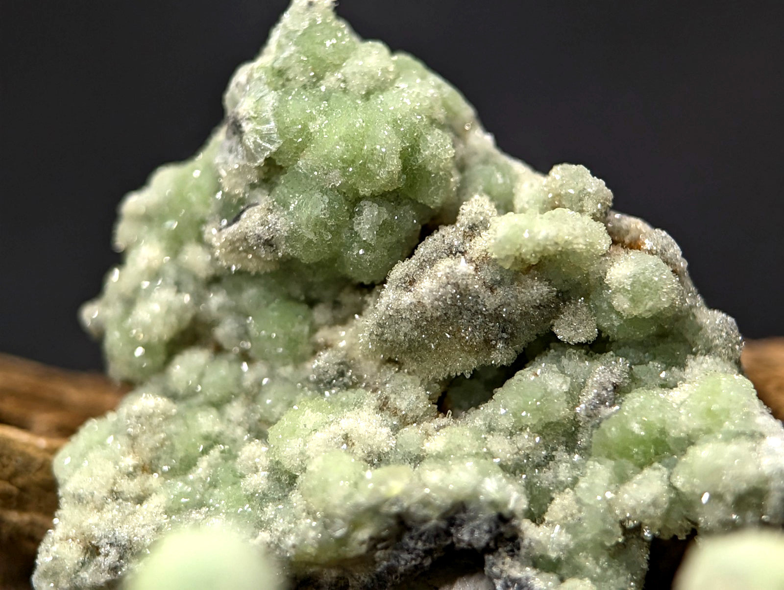 Super unique set of 6 Wavellite specimens (lab analysis from the seam material considered these as fluorwavellite variety ie the fluorine analogue of Wavellite based on their chemistry). They show excellent crystallization under magnification. Their hue is unique too. They come securely mounted with ticky tacky on a naturally uv-reactive pine knot wood base. Some collectors say this variety of Wavellite reminded them of Moss, so i figured i would make a "Moss on a Log" Wavellite set. One of a Kind Display Piece. The bottom is cut flat and sanded smooth. The wood itself is naturally infused with the resin of the tree it came from, so it smells wonderful too, like the Arkansas forests from where it was unearthed.