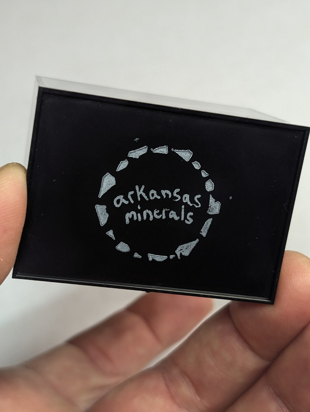 It is mounted in our new boxes we designed and made utilizing a naturally UV reactive Pine knot wood that comes from our land in Arkansas. The back is a transparent photographic print of one of our photos of the inside of a "vug" of arkansas wavellite (like a crystal cave of sorts). These are unique and exclusive to our shop.